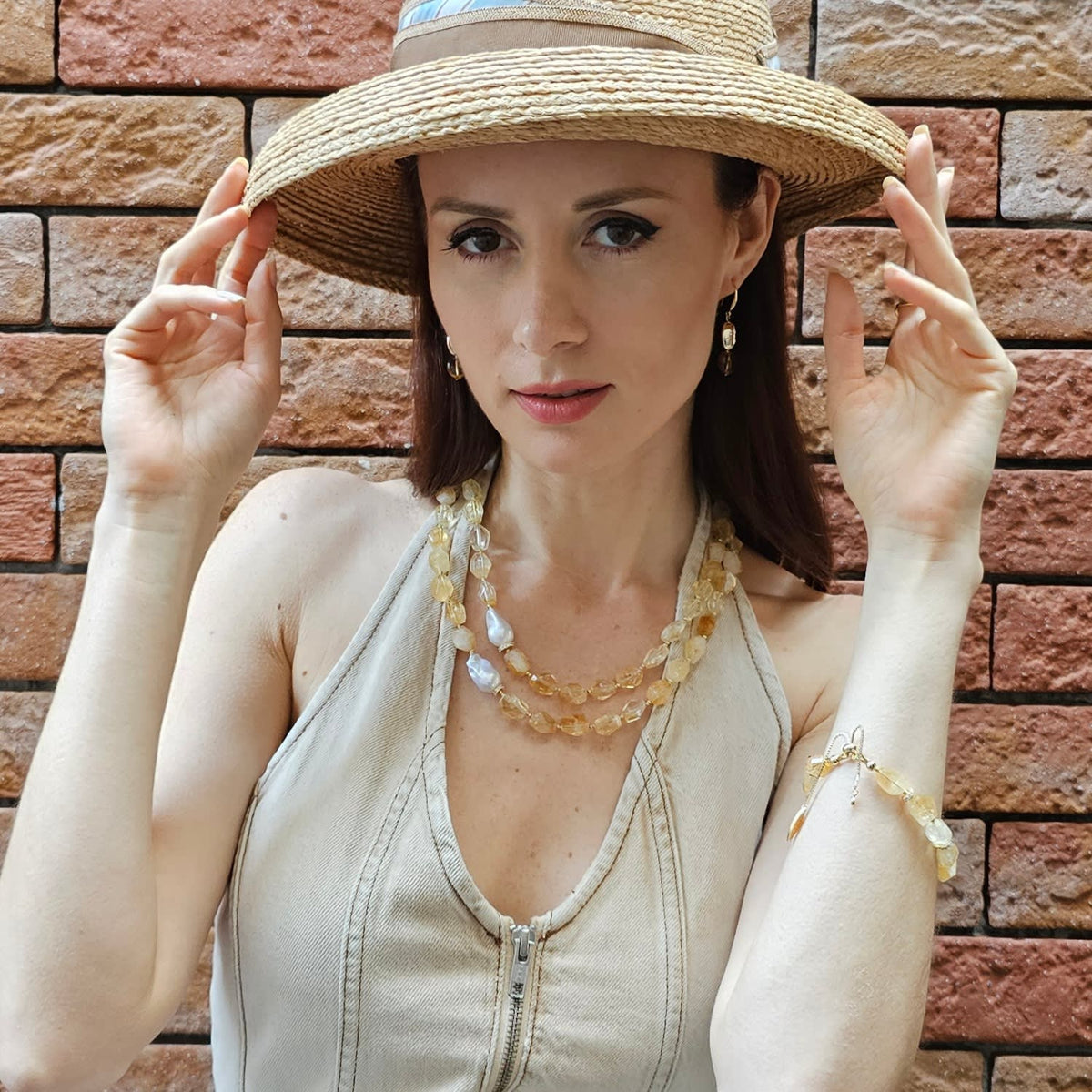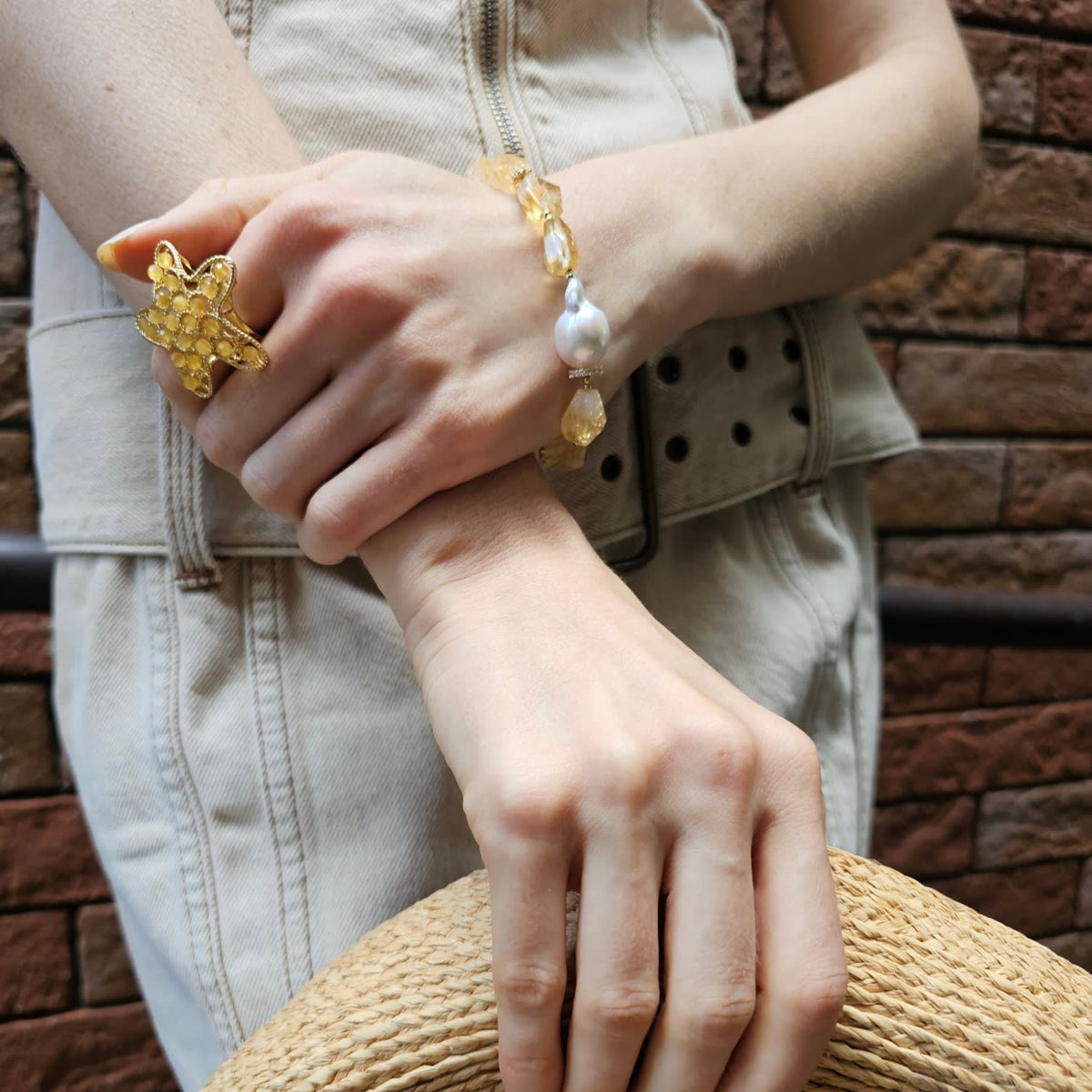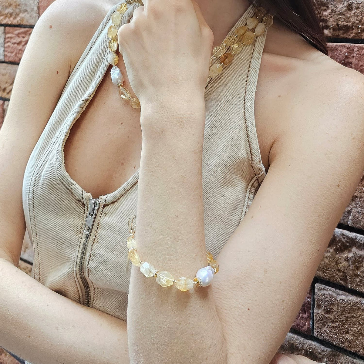 This bracelet features faceted citrine stones and a baroque pearl. It is an adjustable bracelet with sparkling accents.