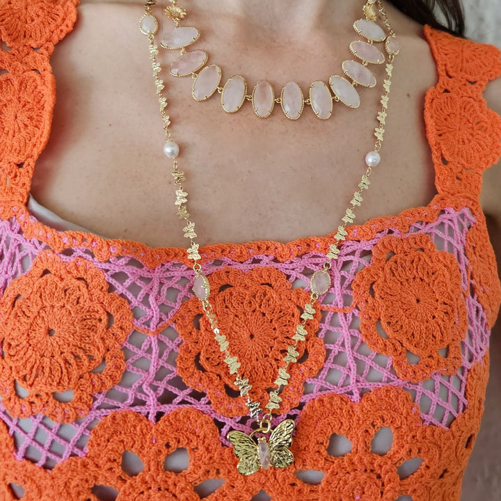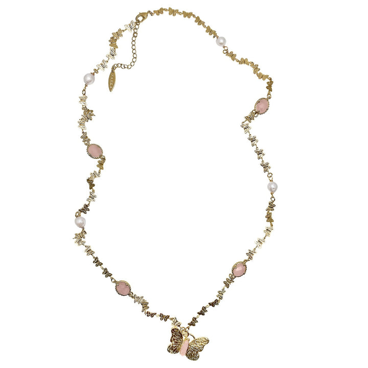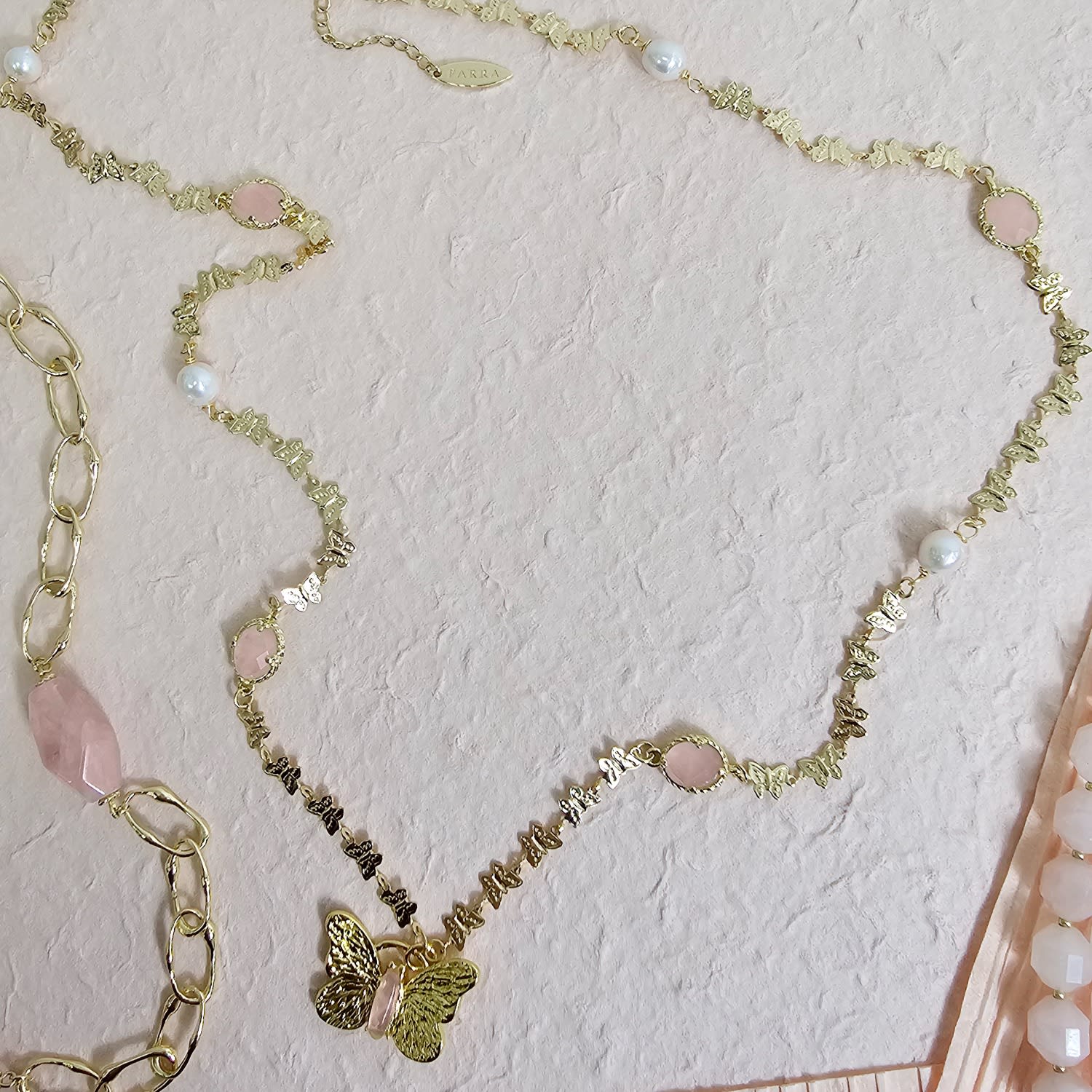 This necklace is crafted with a butterfly pendant and features rose quartz stones. The long chain is also shaped like butterflies.