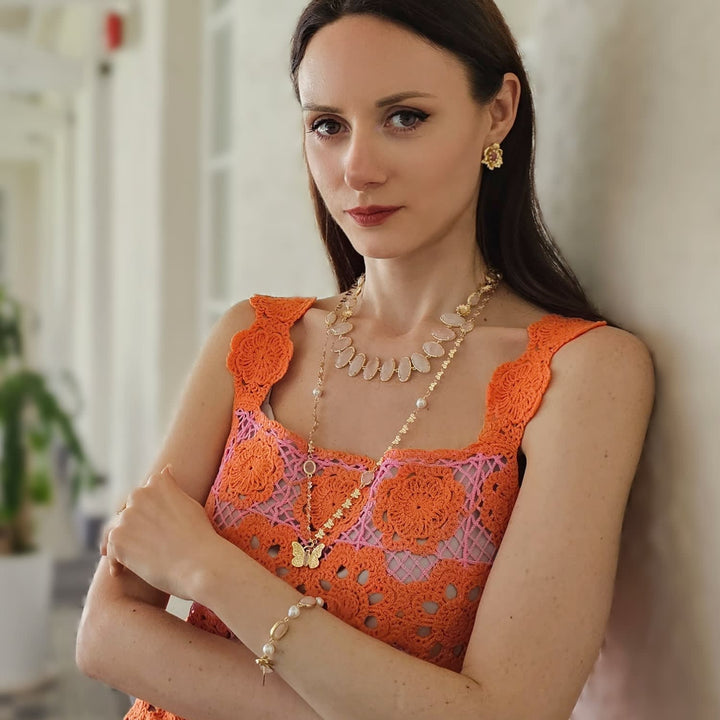 This Butterfly Pendant With Rose Quartz Stones Long Necklace by Farra is an exquisite and meaningful piece that celebrates love and transformation. A charming butterfly pendant, adorned with delicate rose quartz stones, symbolizes emotional healing and freedom. The long chain, elegantly shaped like butterflies, enhances the overall aesthetic, making this necklace a versatile and whimsical accessory for any occasion.