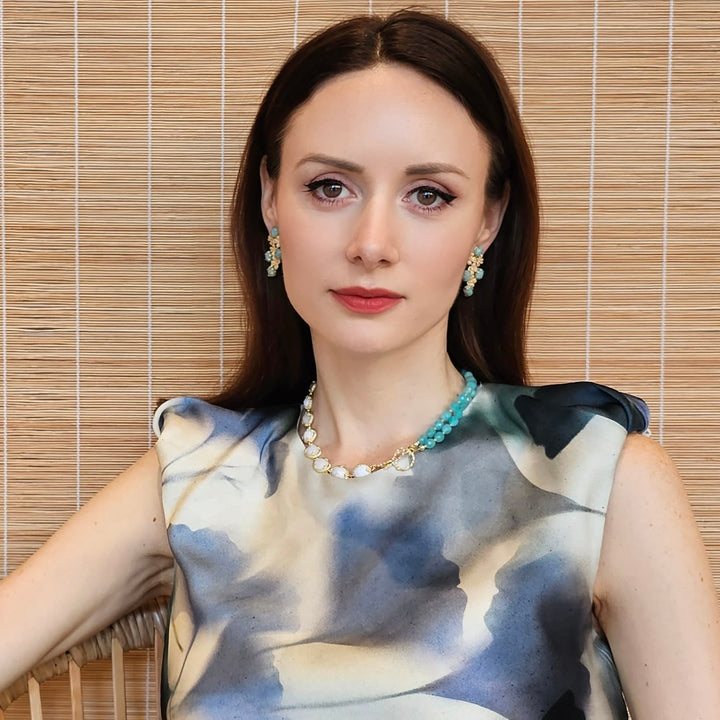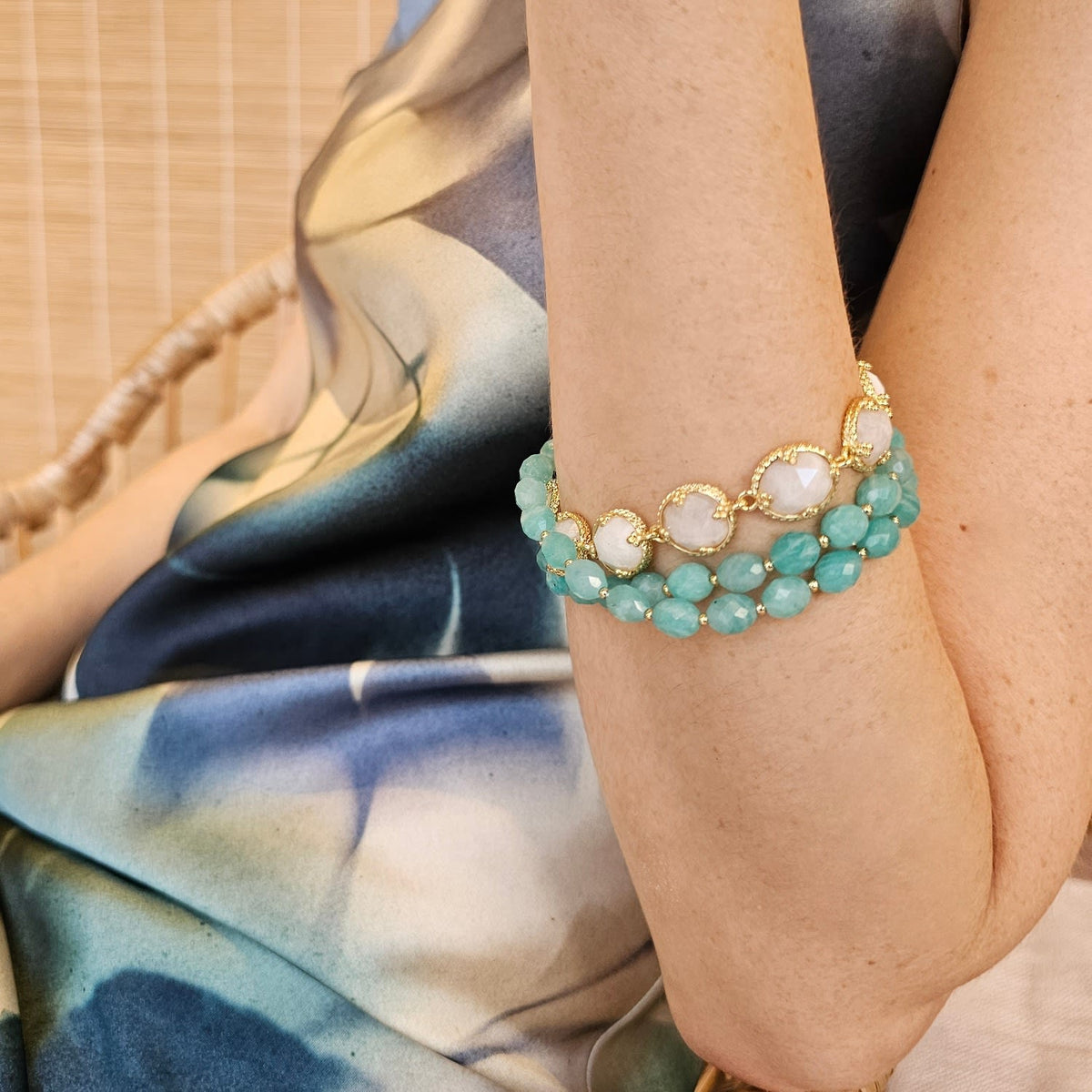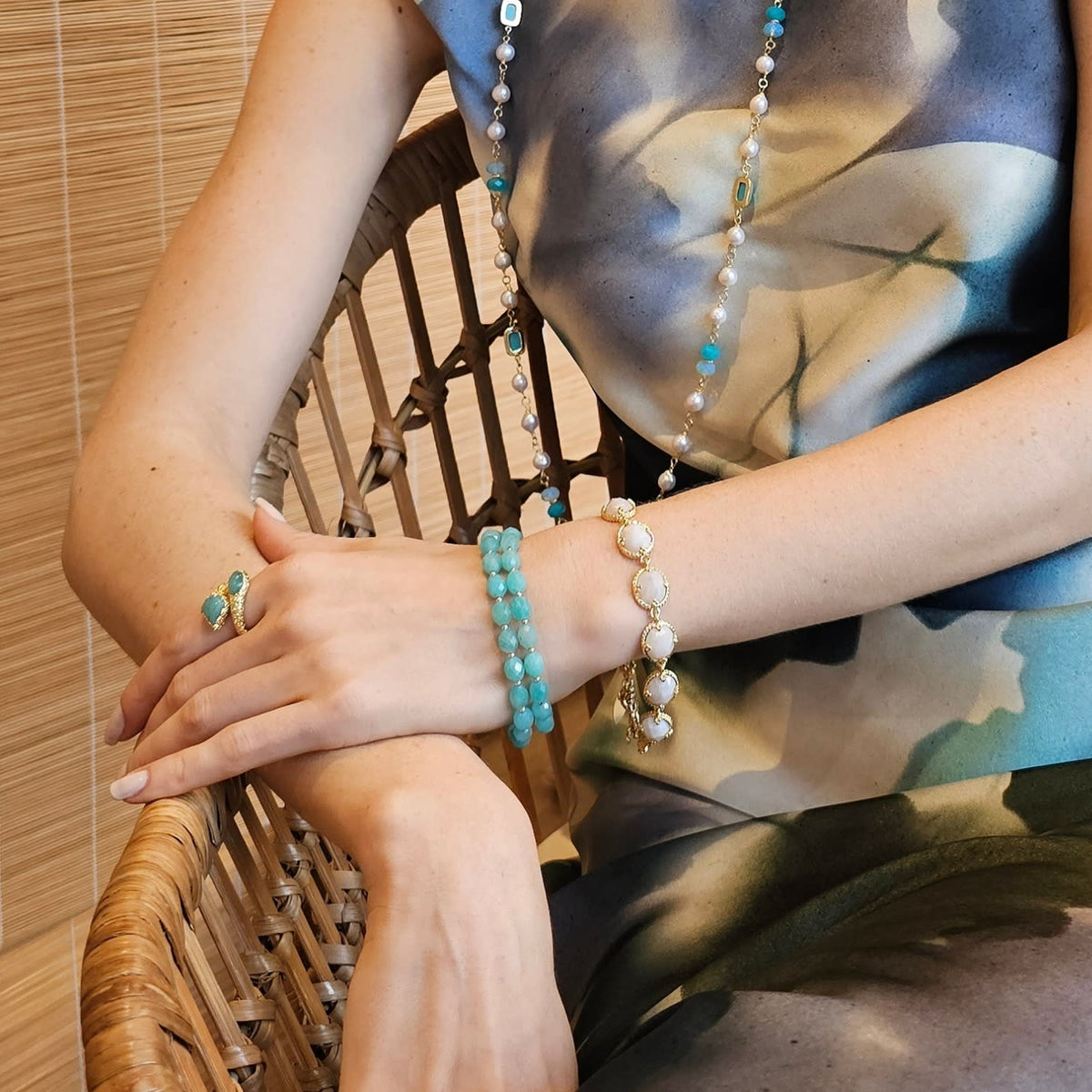 This Amazonite With White Moonstone Versatile Necklace by Farra is a stunning and versatile piece that combines the calming energy of amazonite with the ethereal glow of white moonstone. Its innovative clasp allows the necklace to be easily transformed into two stylish bracelets, making it a must-have accessory that adapts to your style and adds a touch of emotional harmony to your look.