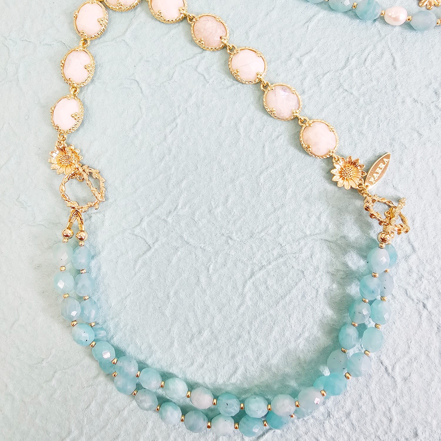 This necklace is crafted with amazonite and white moonstone and features an innovative clasp that allows it to be separated into two bracelets.