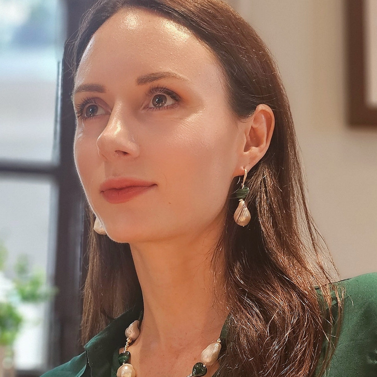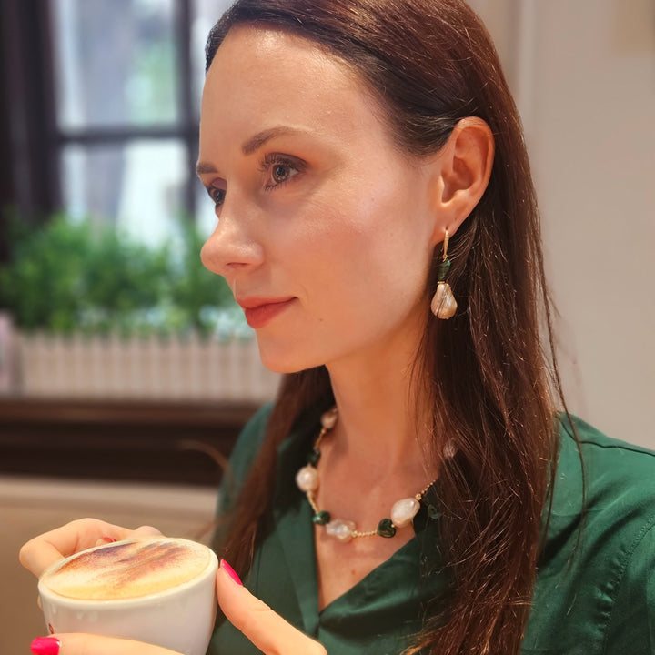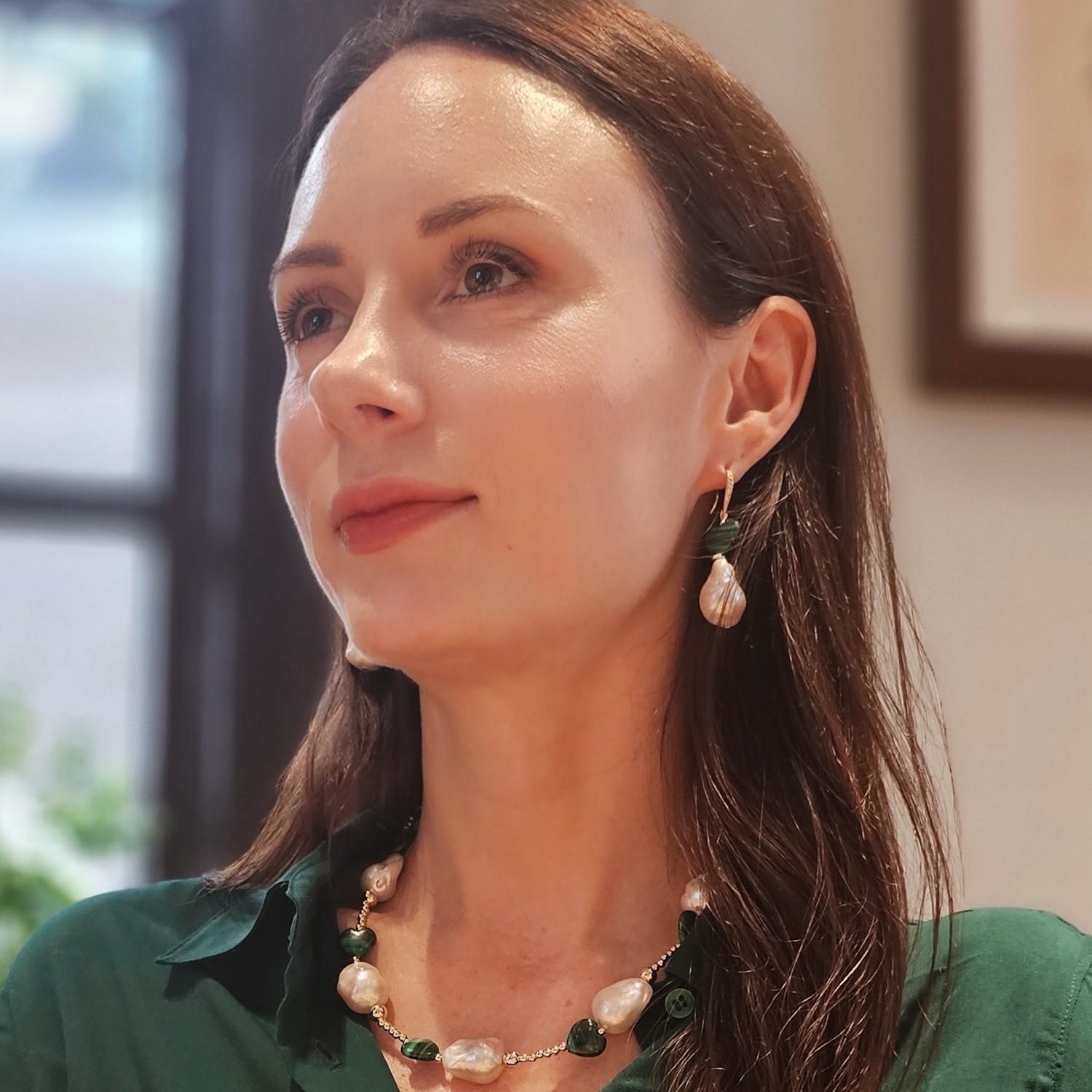 These Baroque Pearls With Heart Malachite Earrings by Farra are a stunning and thoughtful gift. Each earring features a unique baroque pearl paired with a vibrant heart-shaped malachite stone. This combination of natural materials creates a beautiful balance of elegance and charm, with the malachite offering protective and transformative properties.