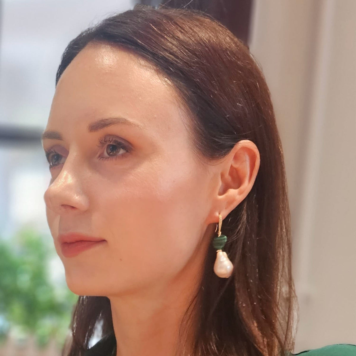 These earrings are made with natural baroque pearls, natural malachite, and 14k gold-plated brass.
