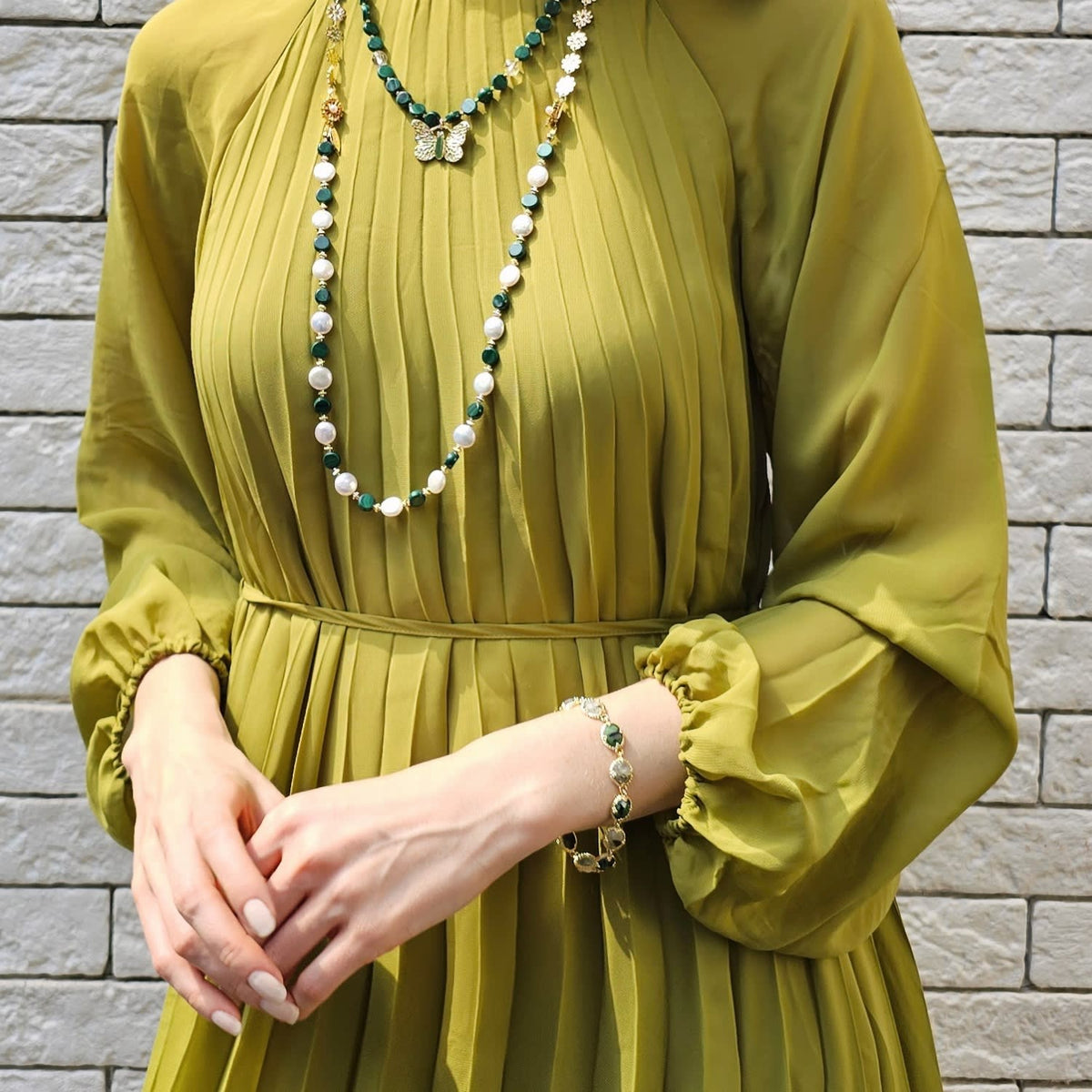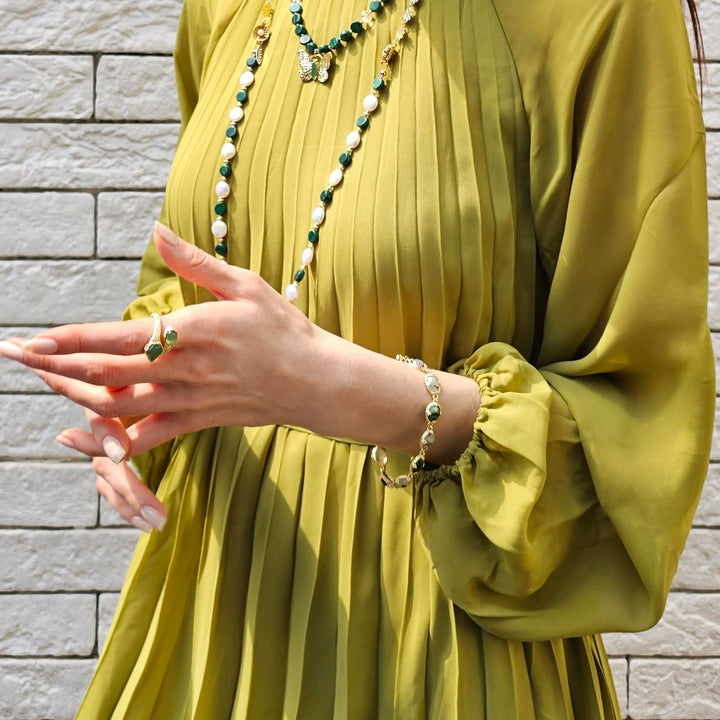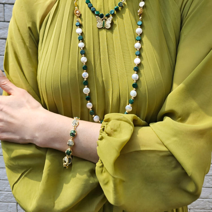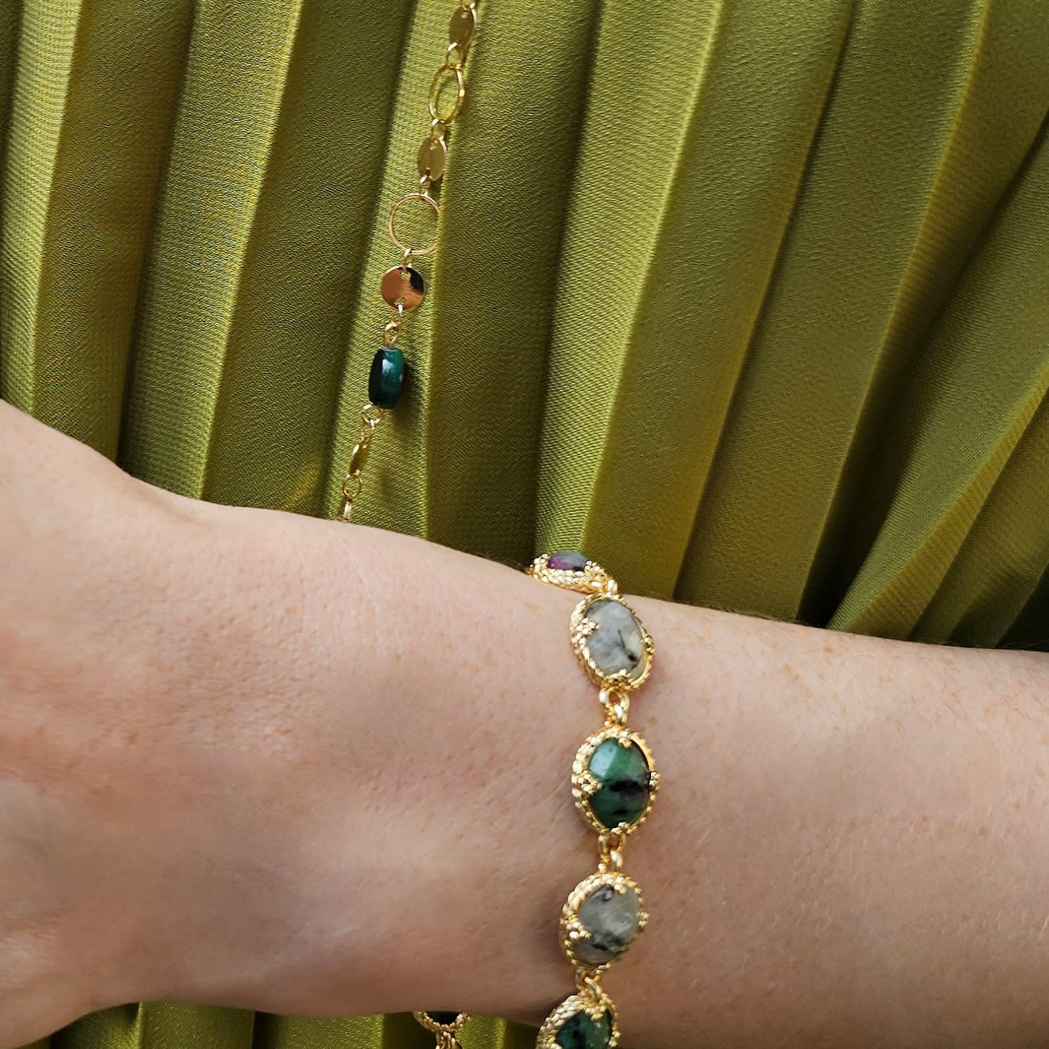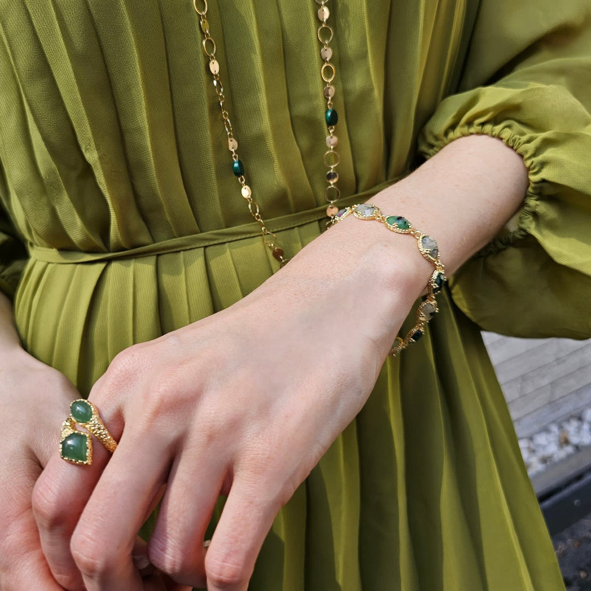 The Green Gemstone Stones Box Clasp Bracelet by Farra is a stunning and elegant piece. The bracelet features an arrangement of faceted epidote and prehnite stones in a delicate gold-tone frame. This piece beautifully showcases the rich hues of nature and can be worn alone as a statement or layered with other bracelets.