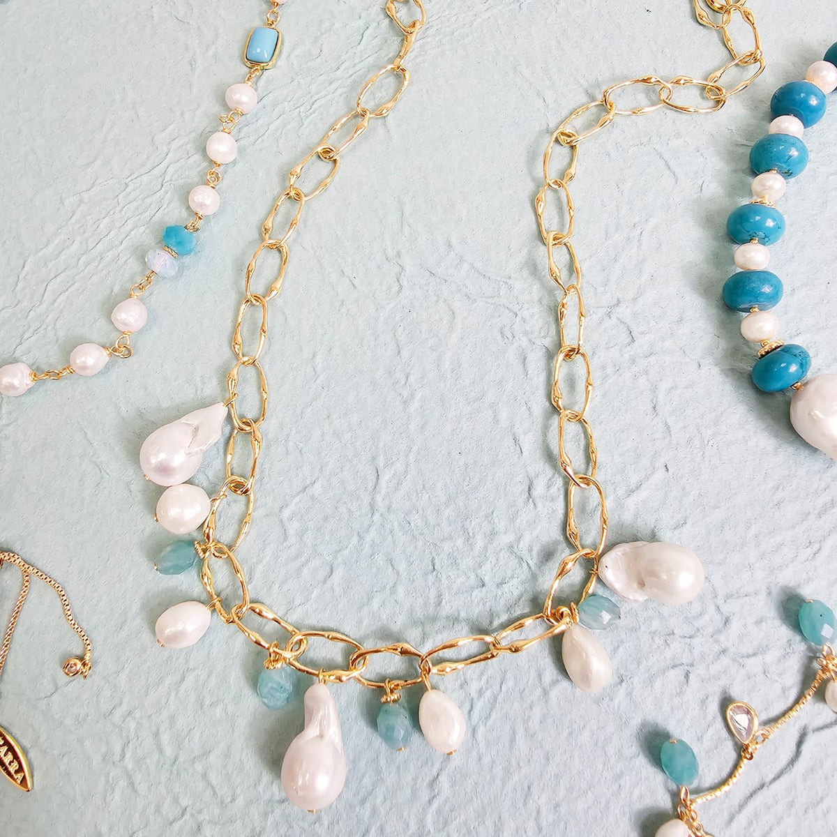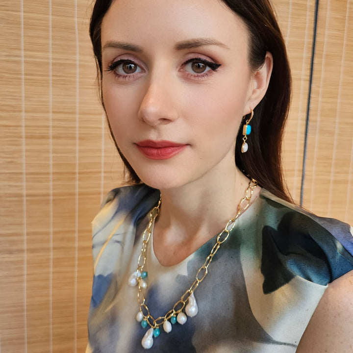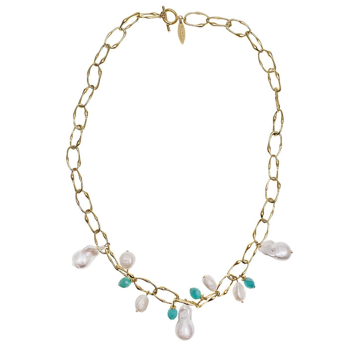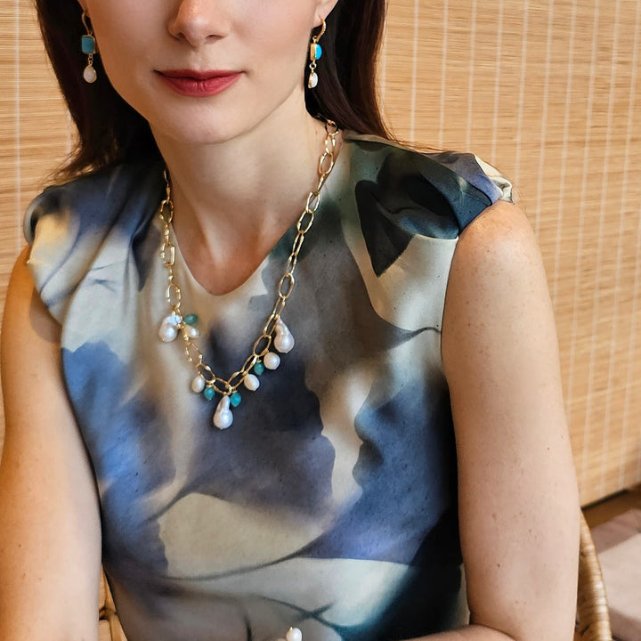 This necklace is made with uniquely shaped baroque pearls and an amazonite charm. It is suspended on a gold-tone chain with an adjustable length.