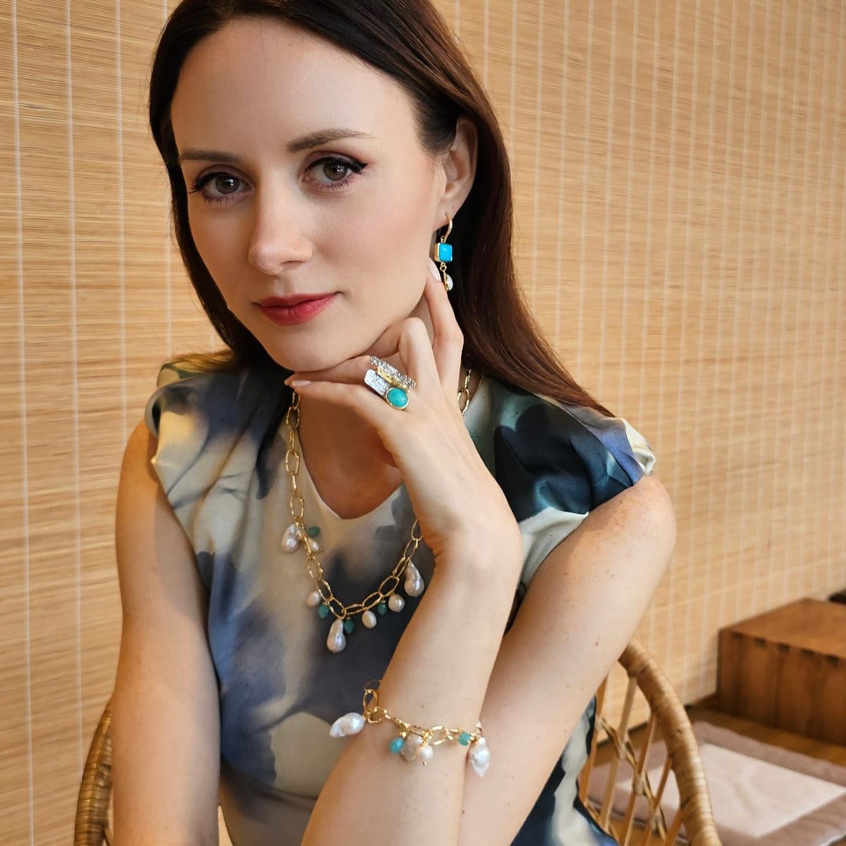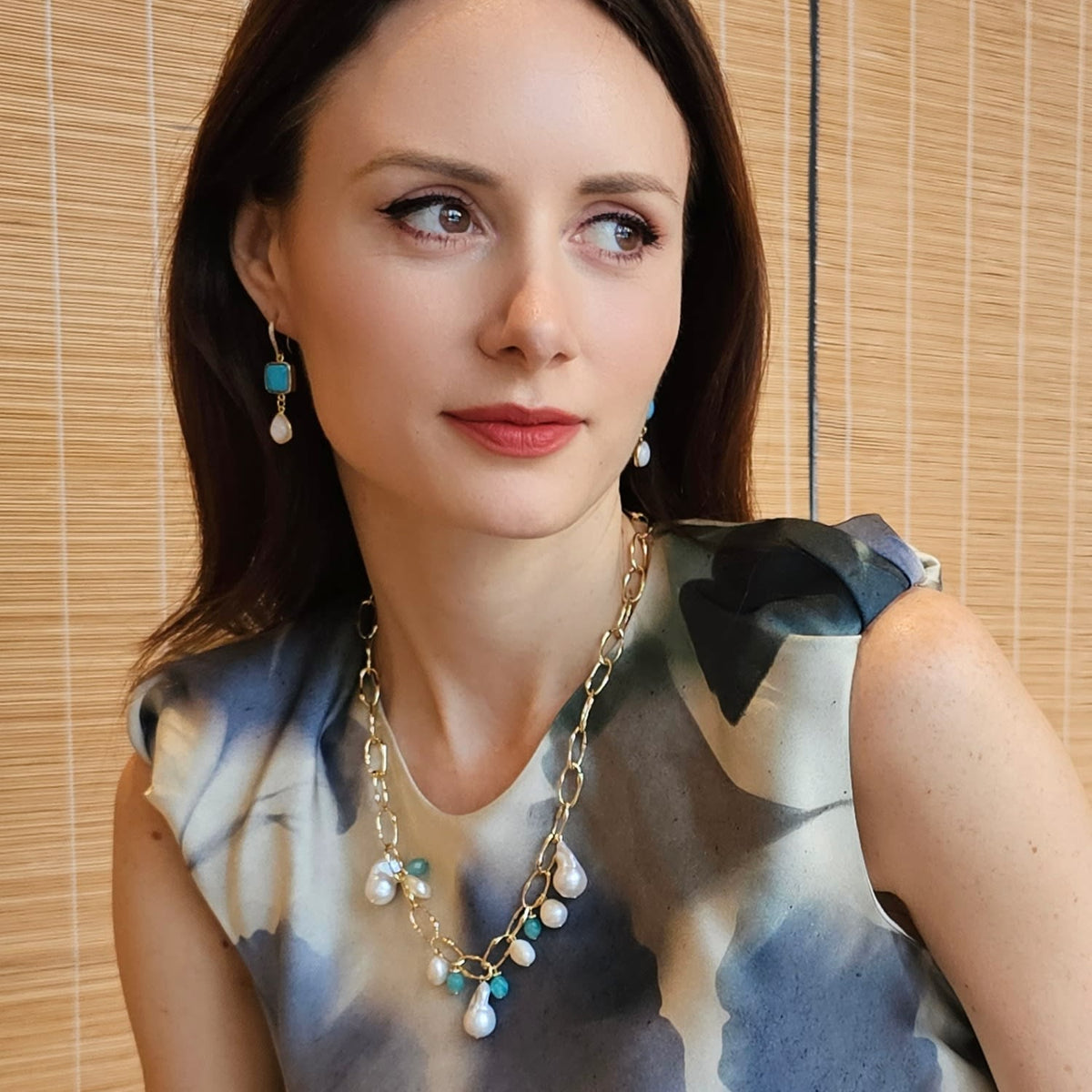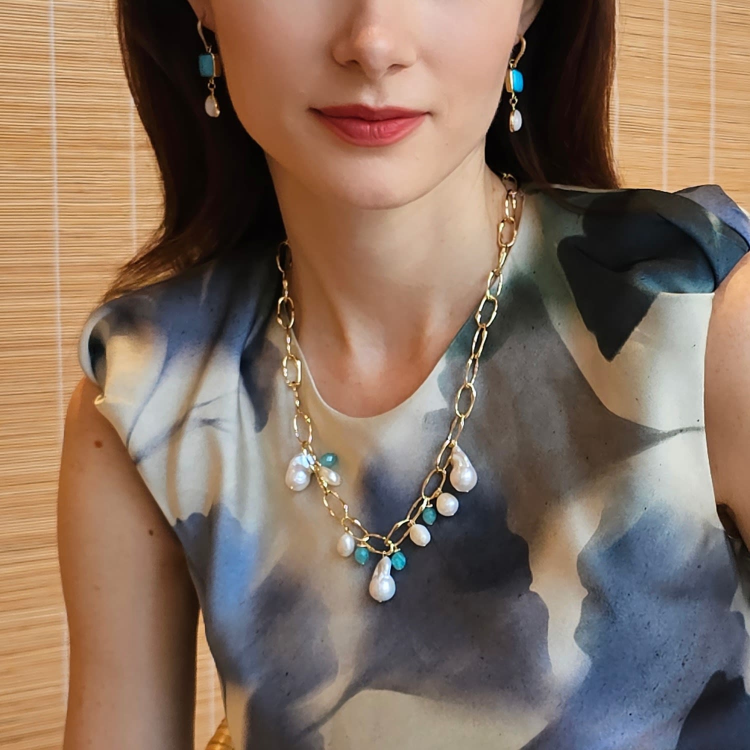 This necklace is made with uniquely shaped baroque pearls and an amazonite charm. It is suspended on a gold-tone chain with an adjustable length.