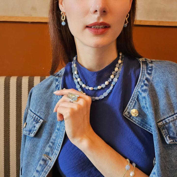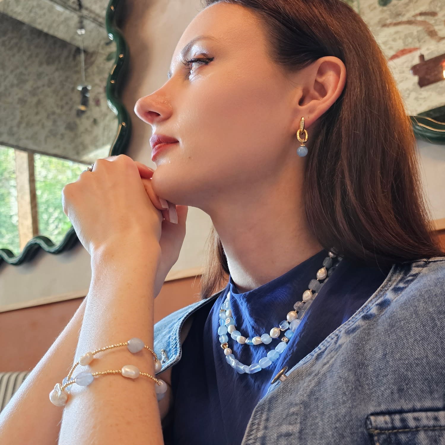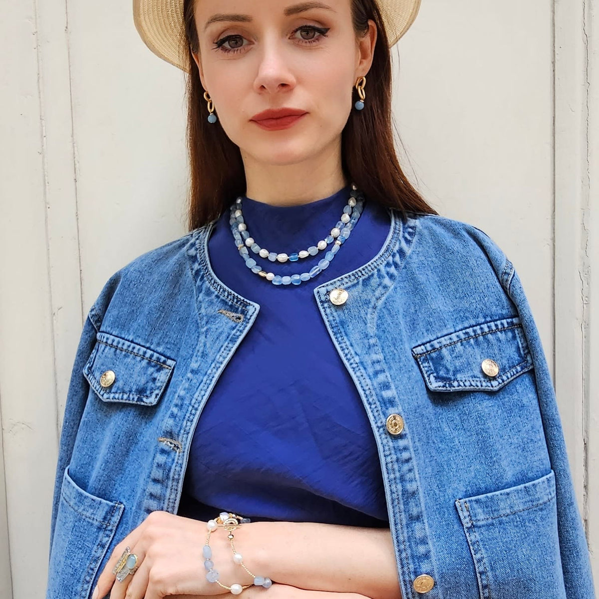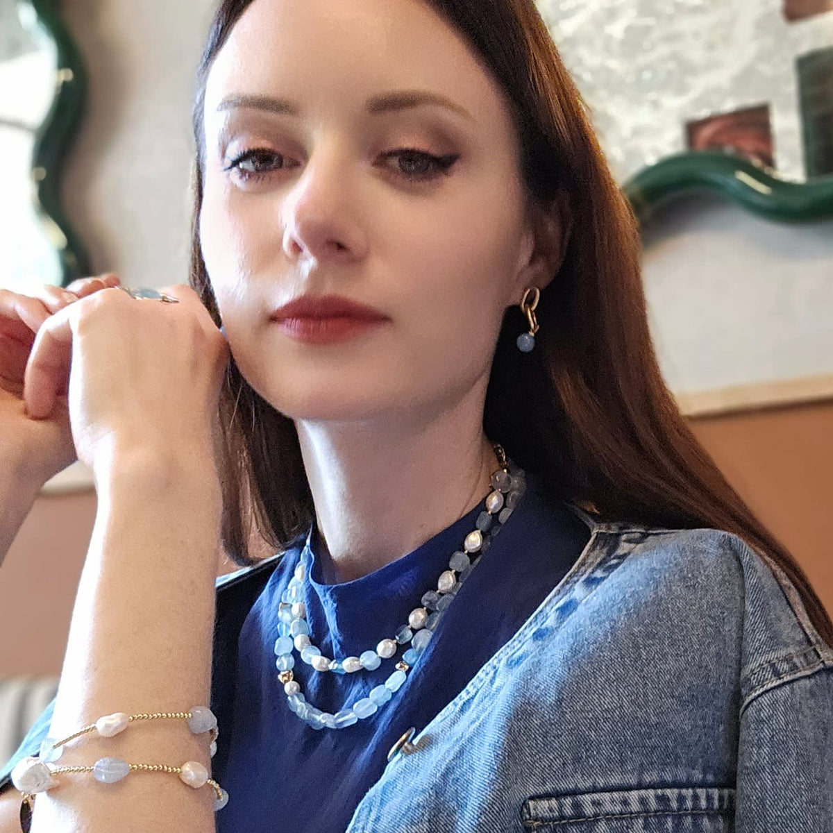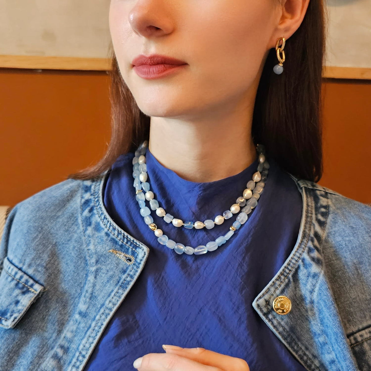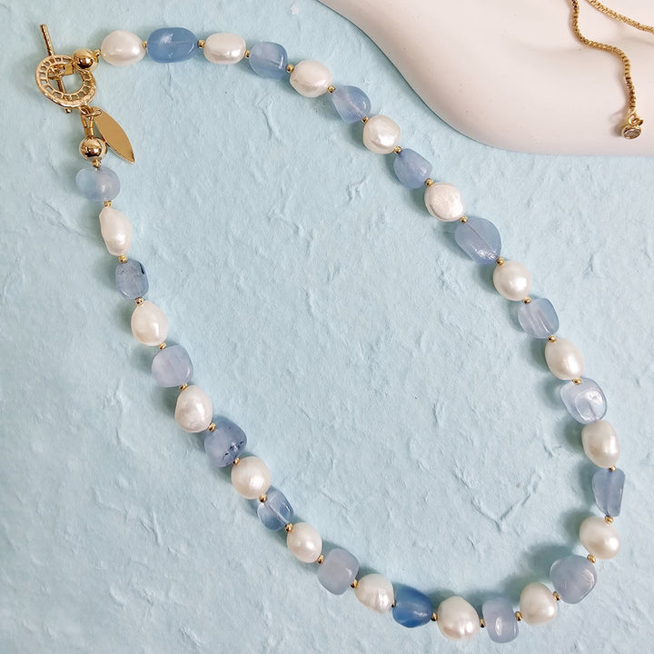 This short necklace features irregular freshwater pearls and aquamarine gemstones.
