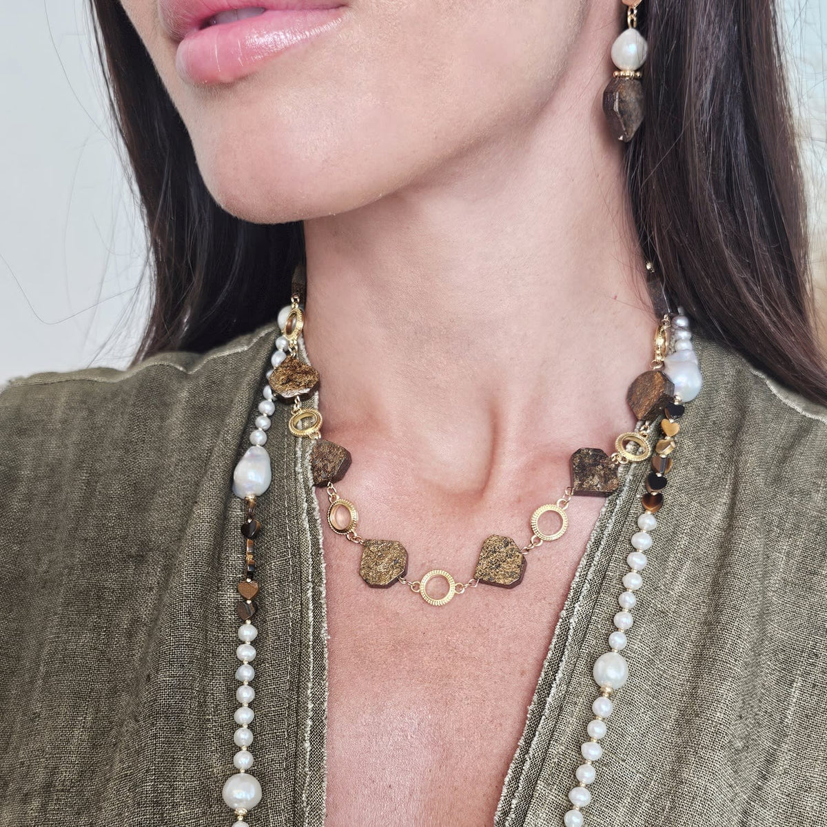 This necklace features chunky tiger-eye stones and gold-toned chain links. It has a secure clasp.