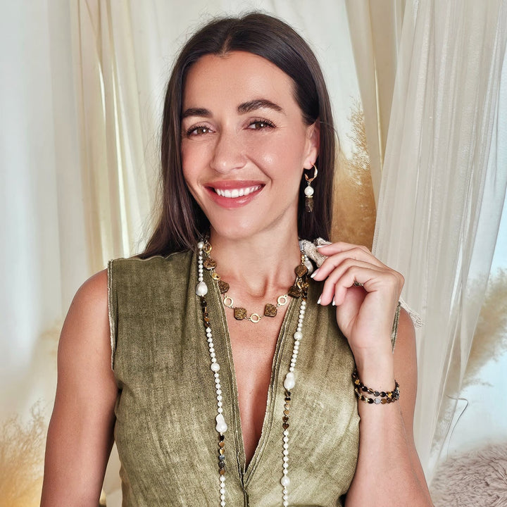This Tiger-Eye Stone With Chain Modern Necklace by Farra is a bold and captivating piece. It features chunky tiger-eye stones, known for their protective properties, interspersed with elegant gold-toned chain links. The necklace is a versatile accessory for both casual and formal occasions, adding confidence and style to any outfit.
