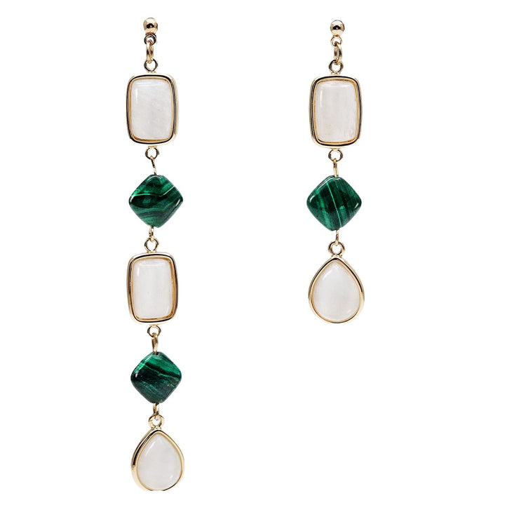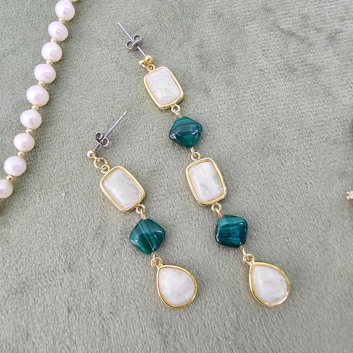 These earrings are made from natural moonstone and natural malachite. They are crafted from 14k gold-plated brass.