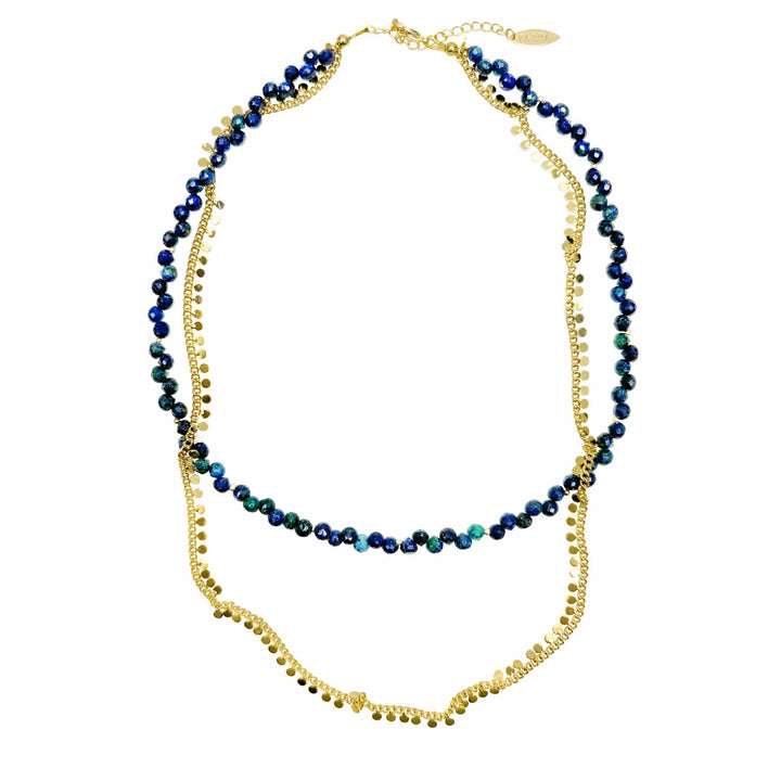 This double-layered necklace is made with natural phoenix lapis gemstones and 14K gold-plated brass.