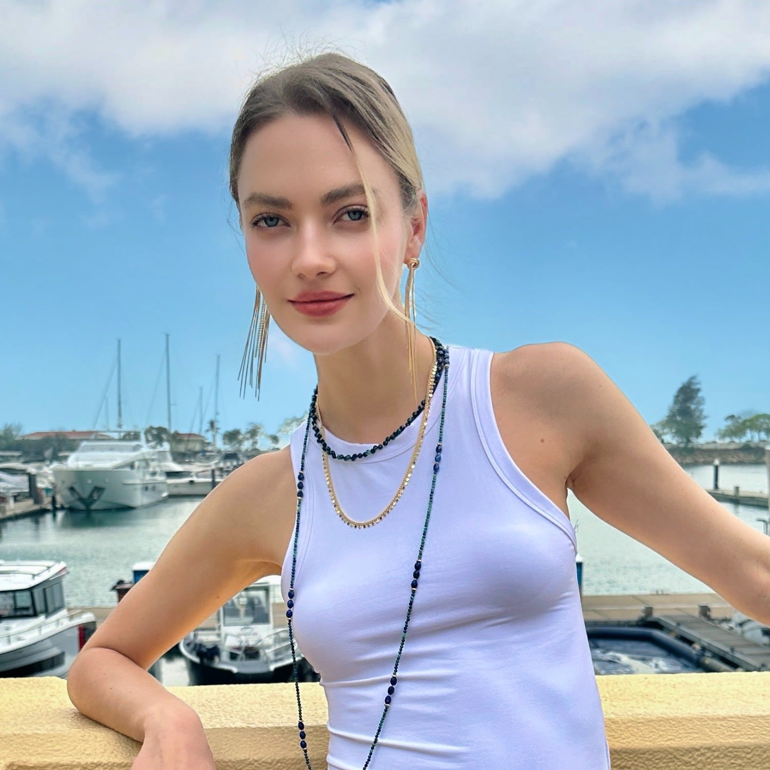 The Phoenix Lapis With Chain Double Layers Necklace by Farra is a luxurious and stylish accessory. The necklace features faceted phoenix lapis gemstones with a deep blue color that evokes a sense of royalty. The delicate double chains elegantly cascade around your neckline, making it both versatile and attention-grabbing.