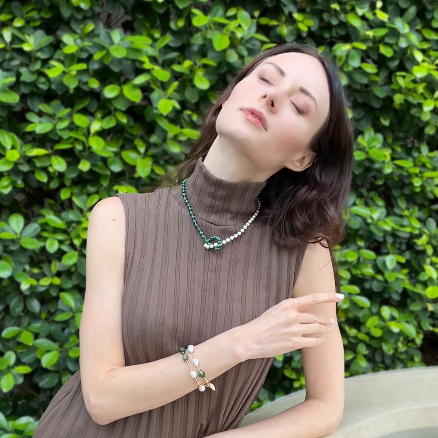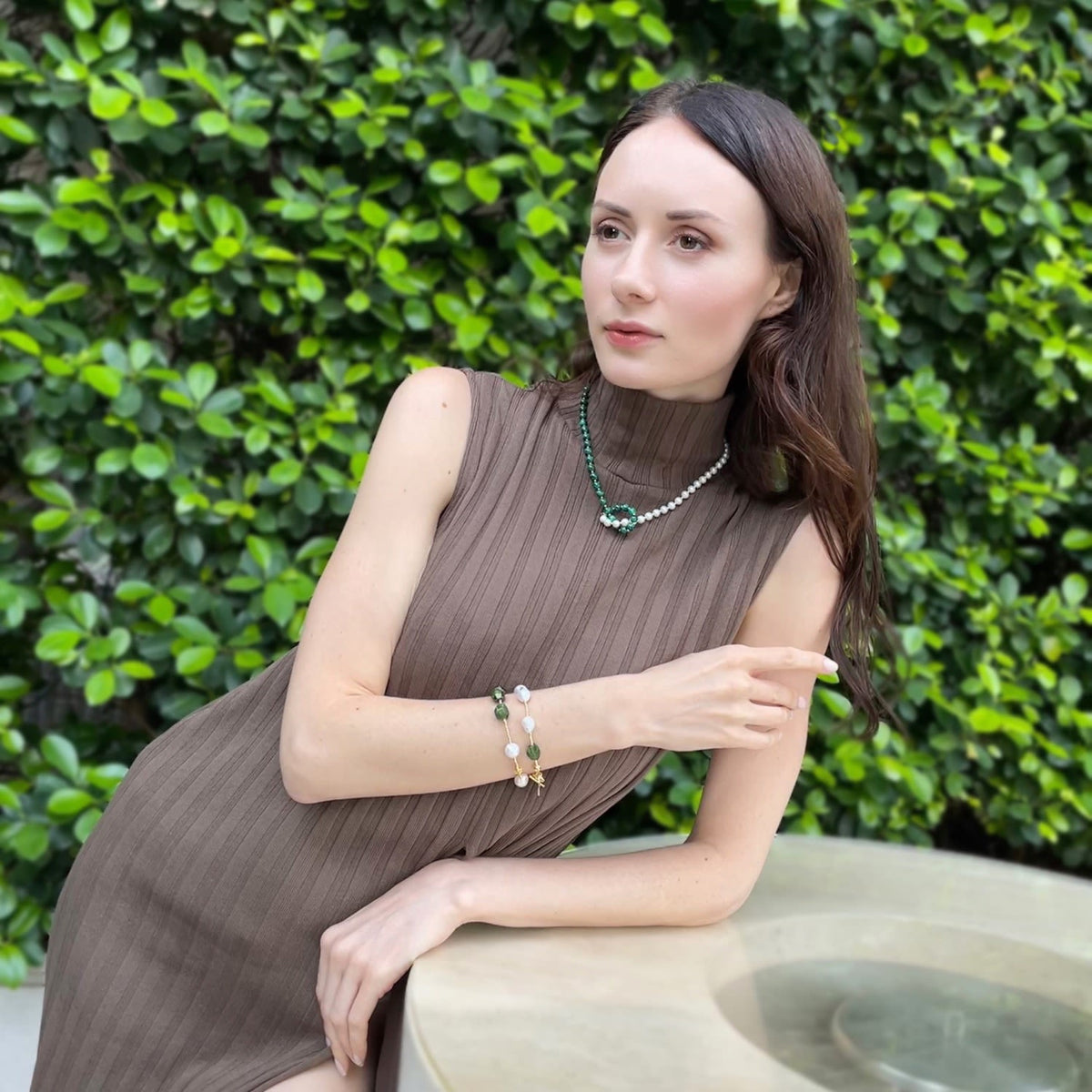 This necklace features white freshwater pearls and green malachite beads. The materials are knotted together.