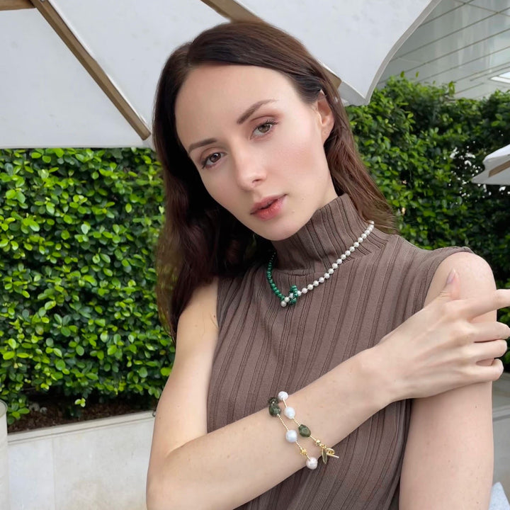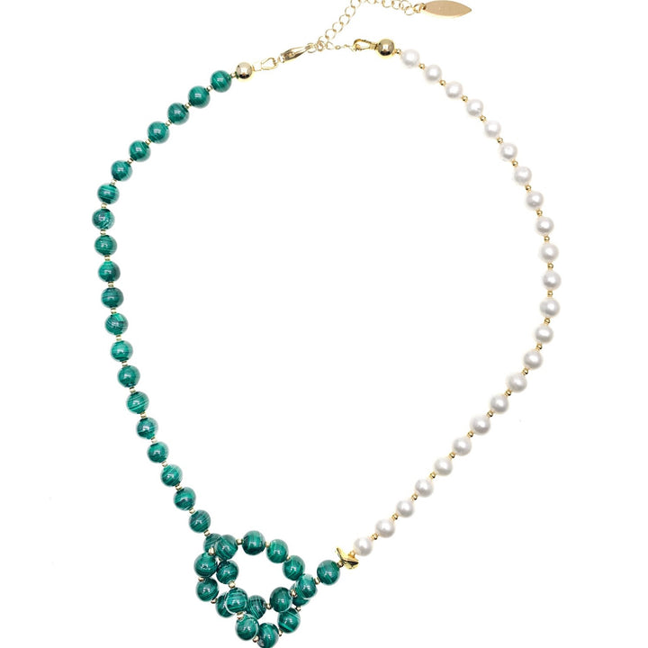 The Malachite With Freshwater Pearl Knotted Necklace by Farra is a visually stunning and meaningful piece. It combines the timeless beauty of white freshwater pearls with the vibrant green hues of natural malachite. Malachite is believed to have emotional healing, protection, and spiritual growth properties, making this necklace a sophisticated accessory that can be worn with a variety of outfits.