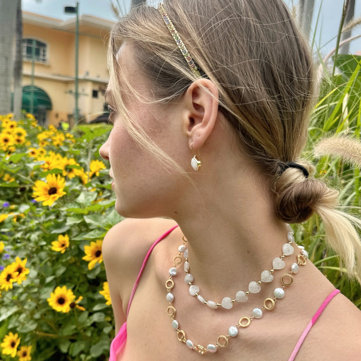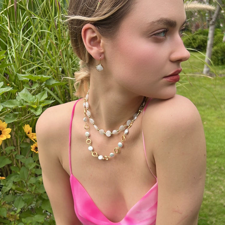 This Gold Chain With Coin-Shaped Freshwater Pearls Necklace by Farra is a sophisticated and timeless piece. It combines an elegant gold chain with the unique beauty of coin-shaped freshwater pearls. This necklace can be worn alone as a statement piece or layered with others for a trendy and personalized look.