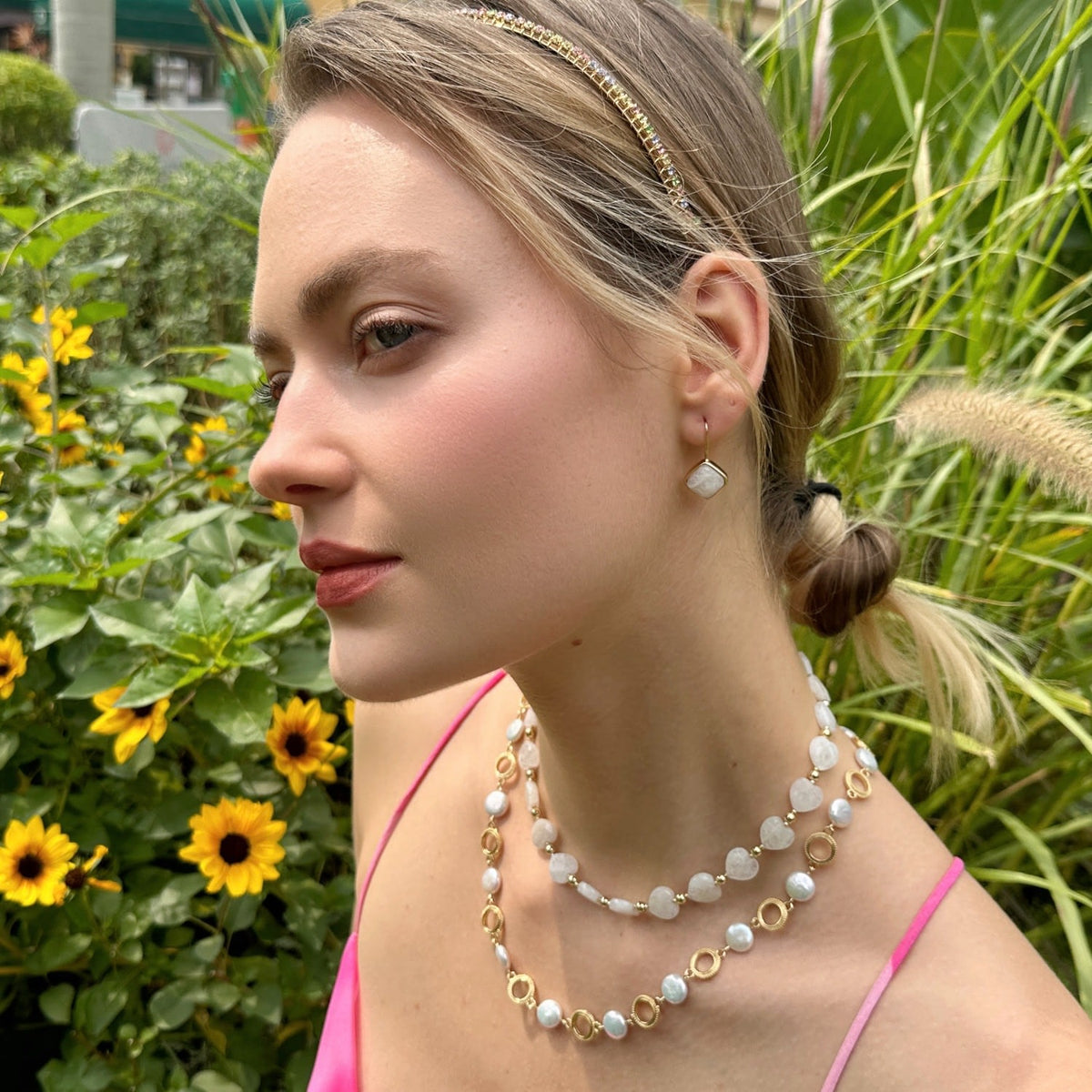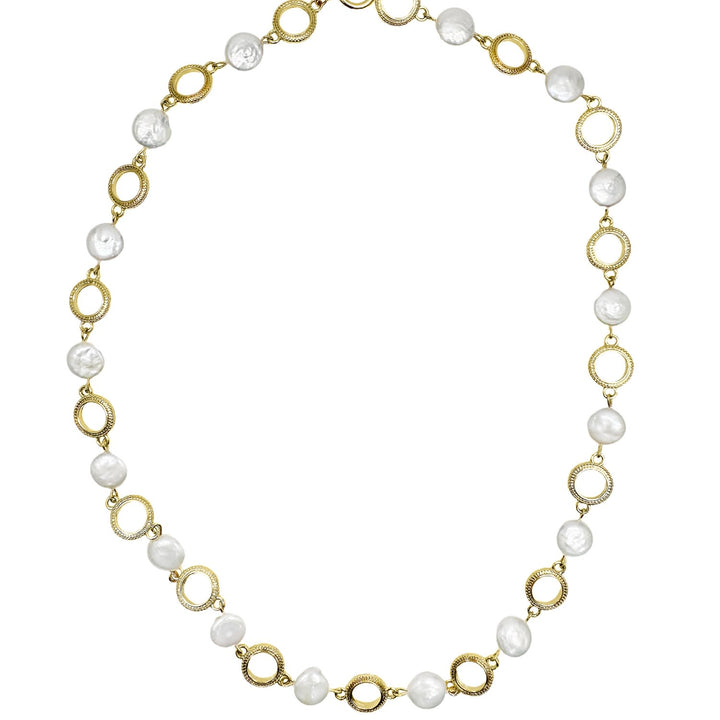 This necklace is made with natural cultured coin-shaped freshwater pearls and 14K gold-plated brass.