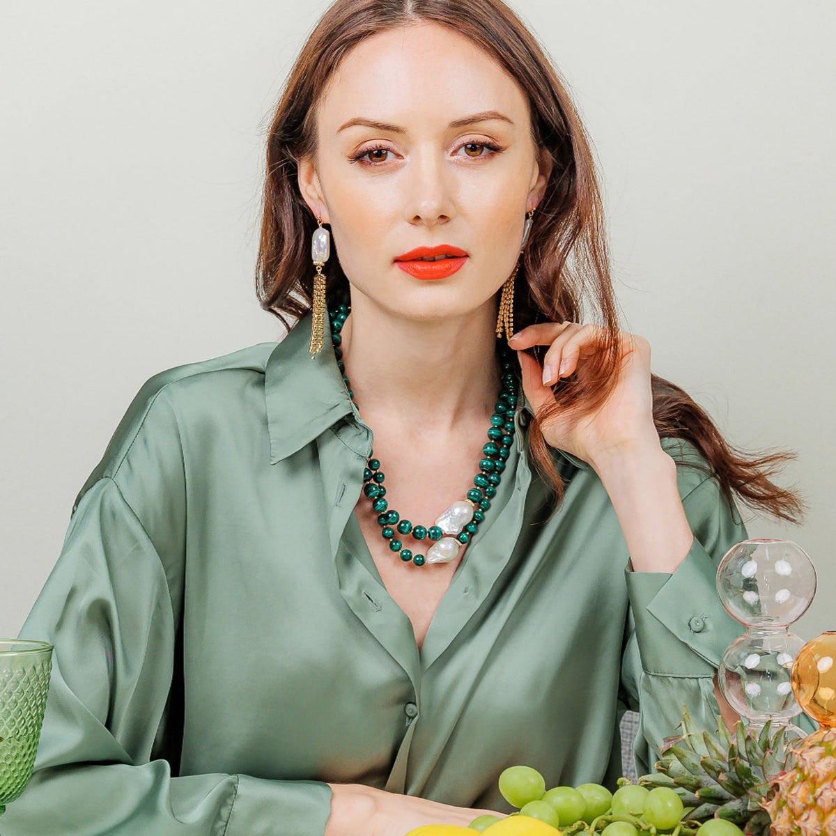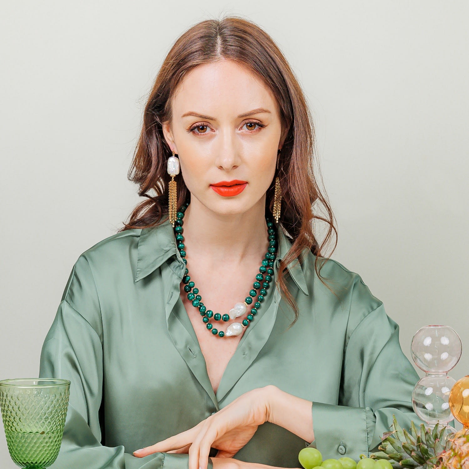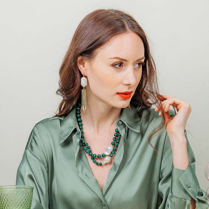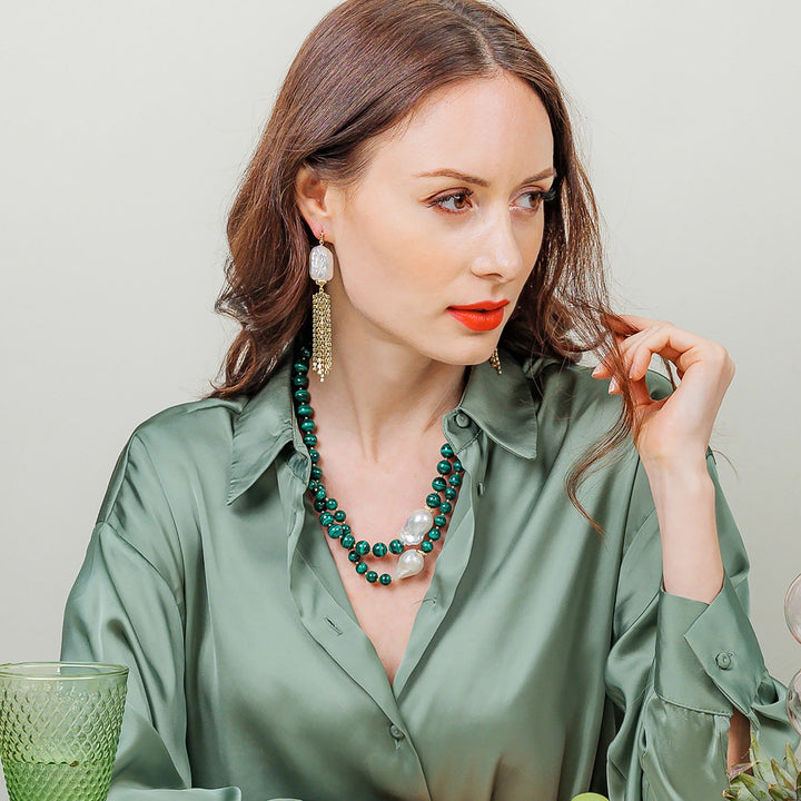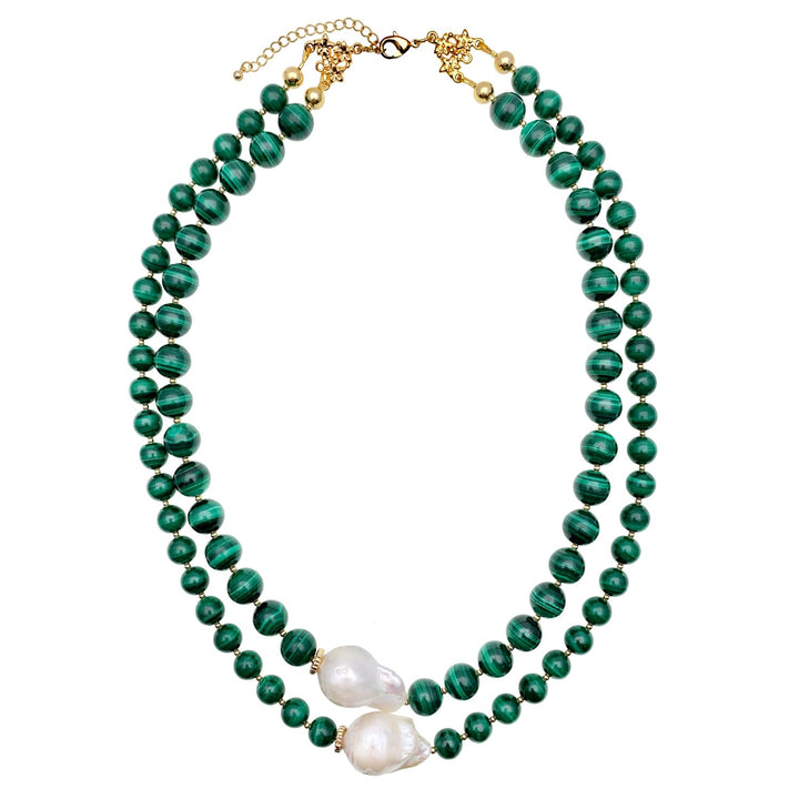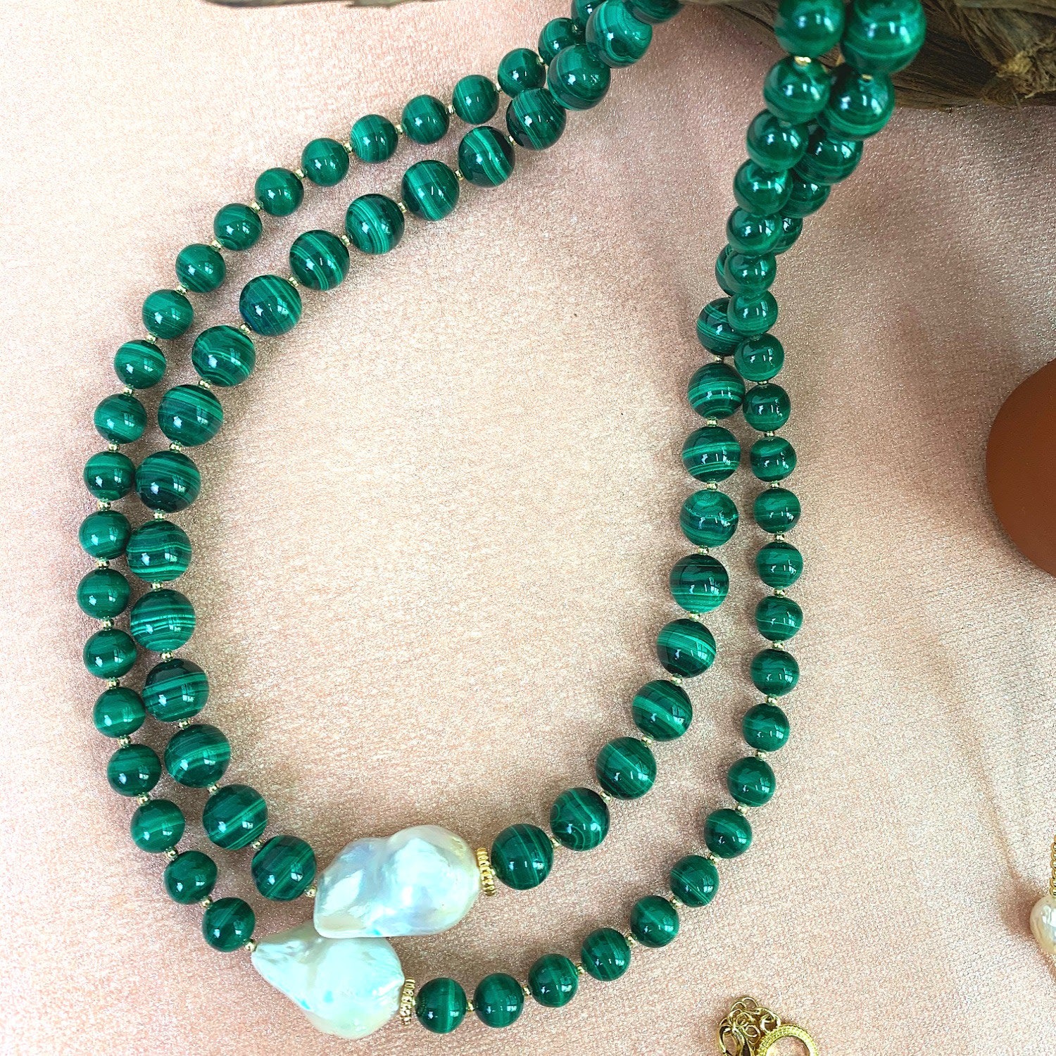 This double-strand necklace features natural malachite beads and baroque pearls.