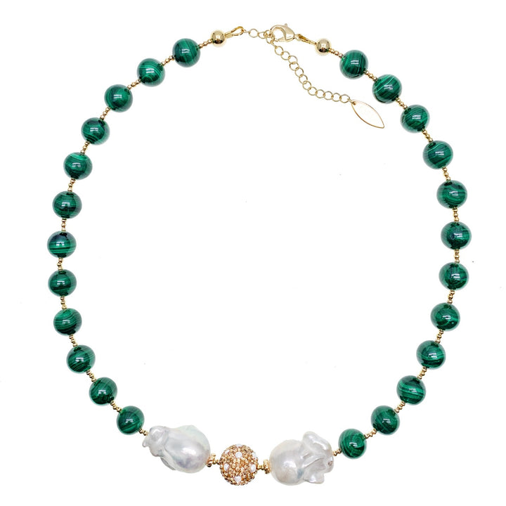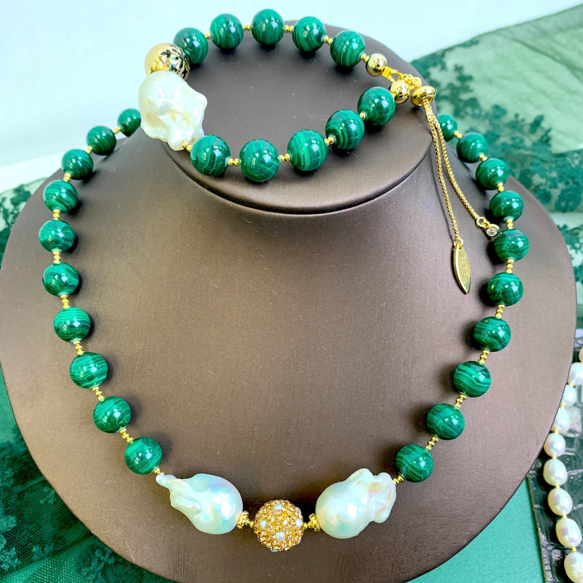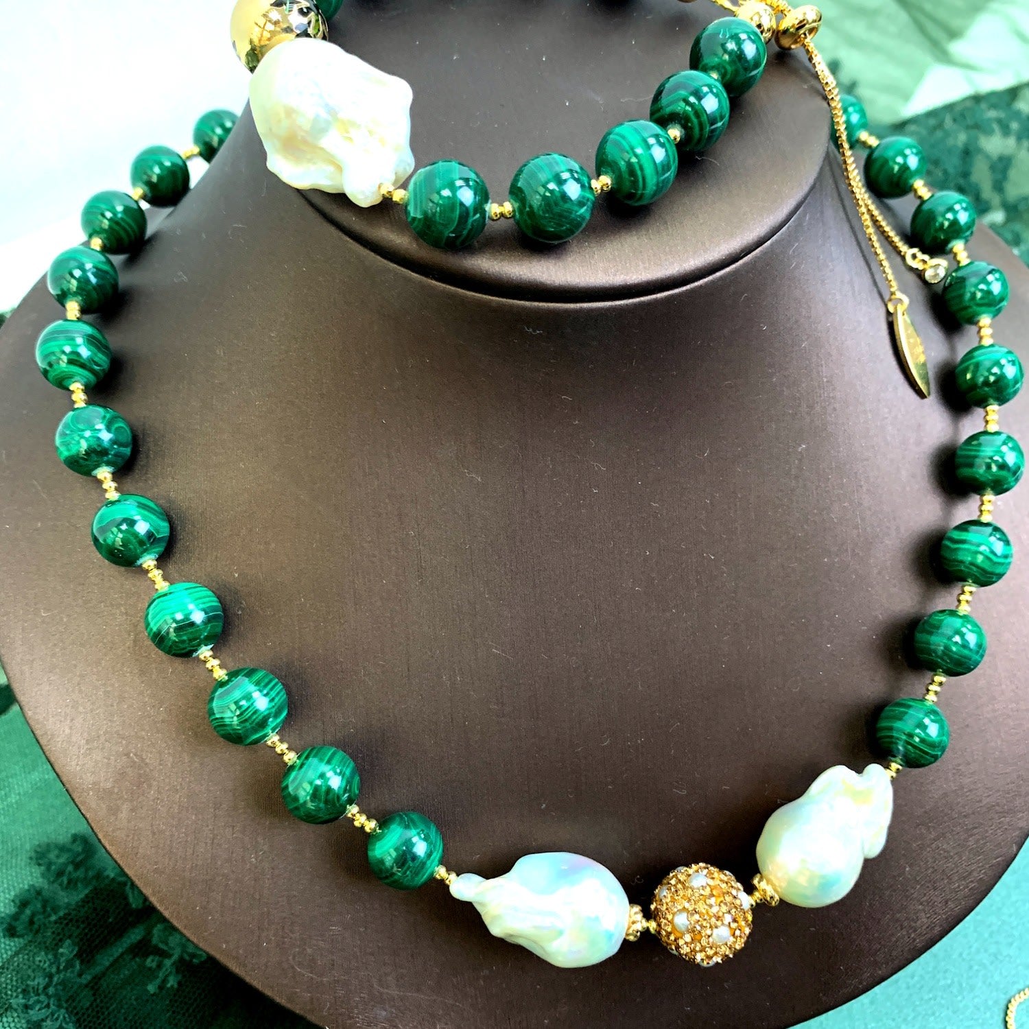 This necklace features natural malachite stones and baroque pearls. The material of the clasp is not specified.