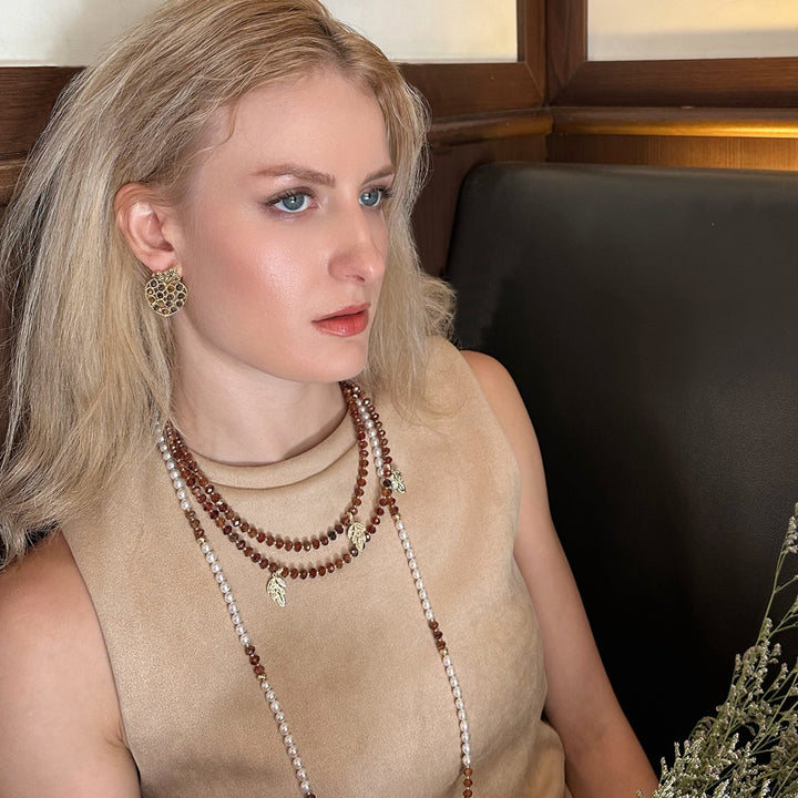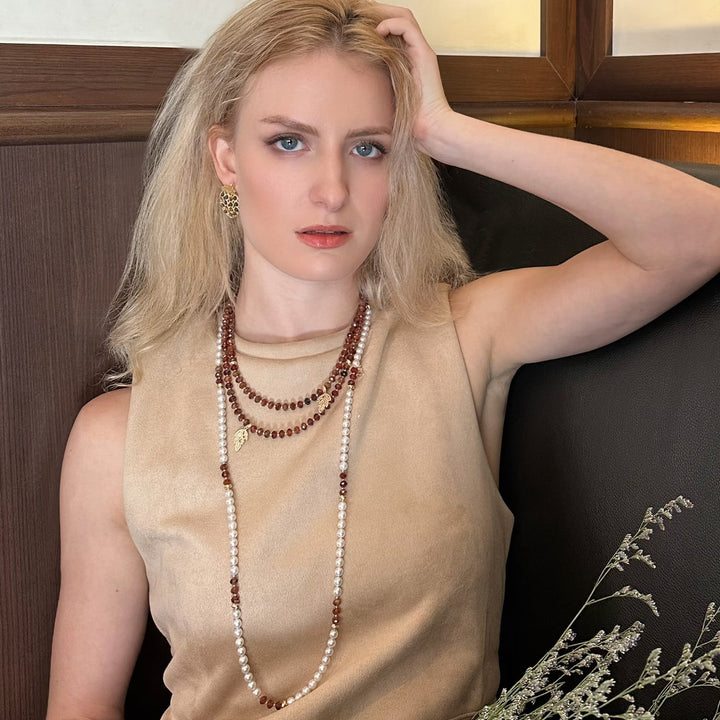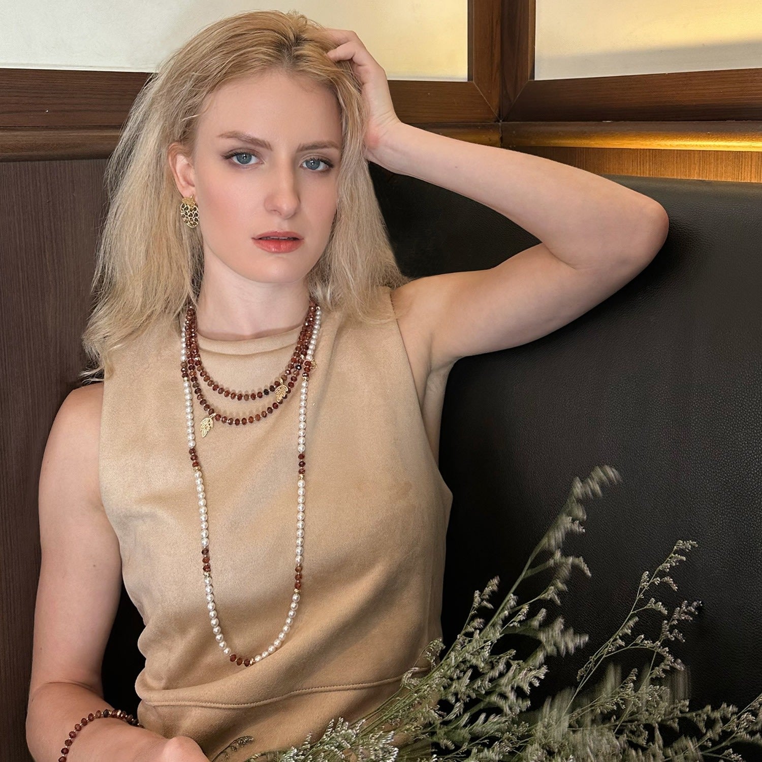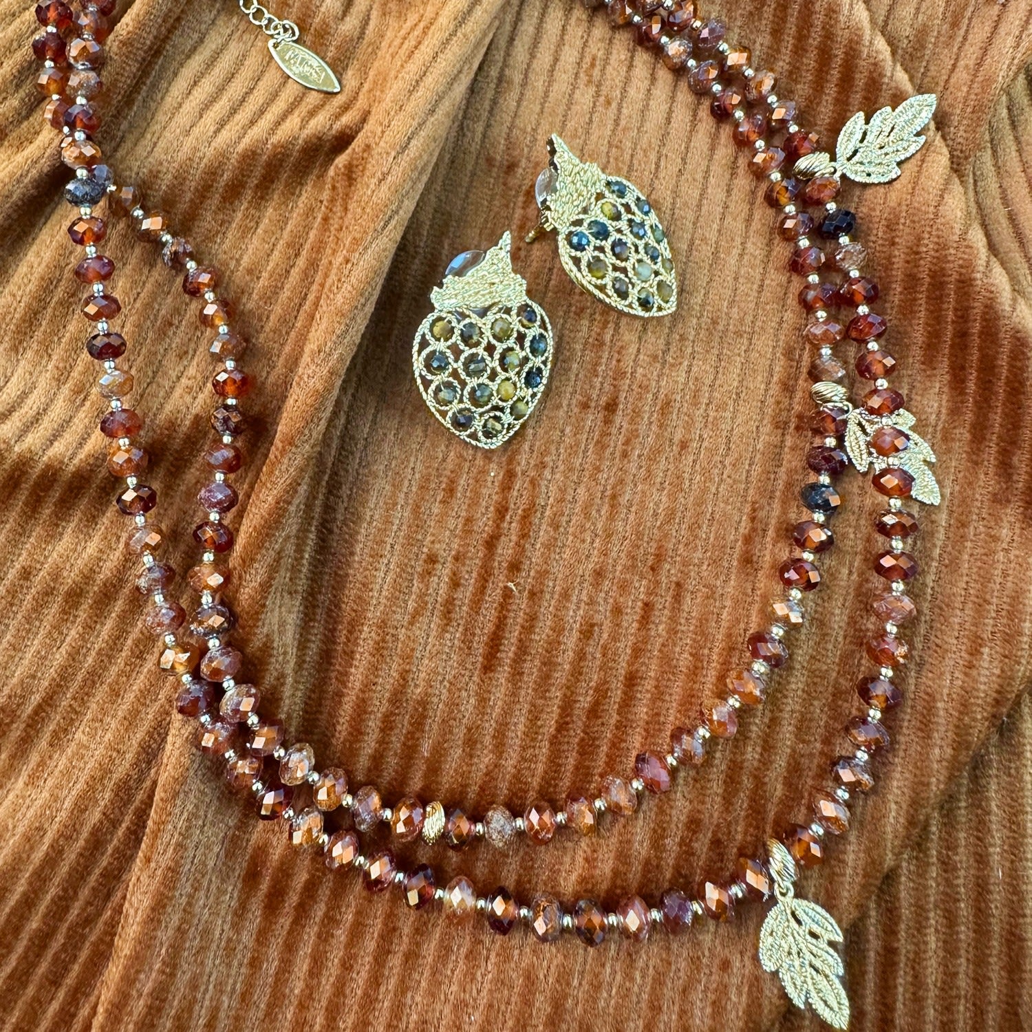 Birthstone Orange Garnet With Leaves Charms Double Strands Necklace