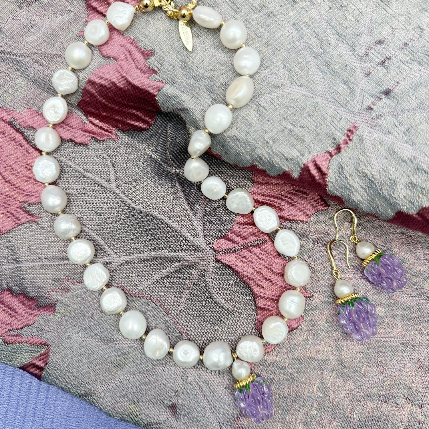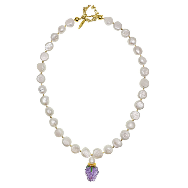 The Irregular Freshwater Pearls With Purple Raspberry Pendant Necklace by Farra is a beautiful and unique piece. It showcases a collection of irregular freshwater pearls that have a lustrous sheen. The necklace is accented with a glass raspberry pendant that adds an artistic and contemporary touch to the design.