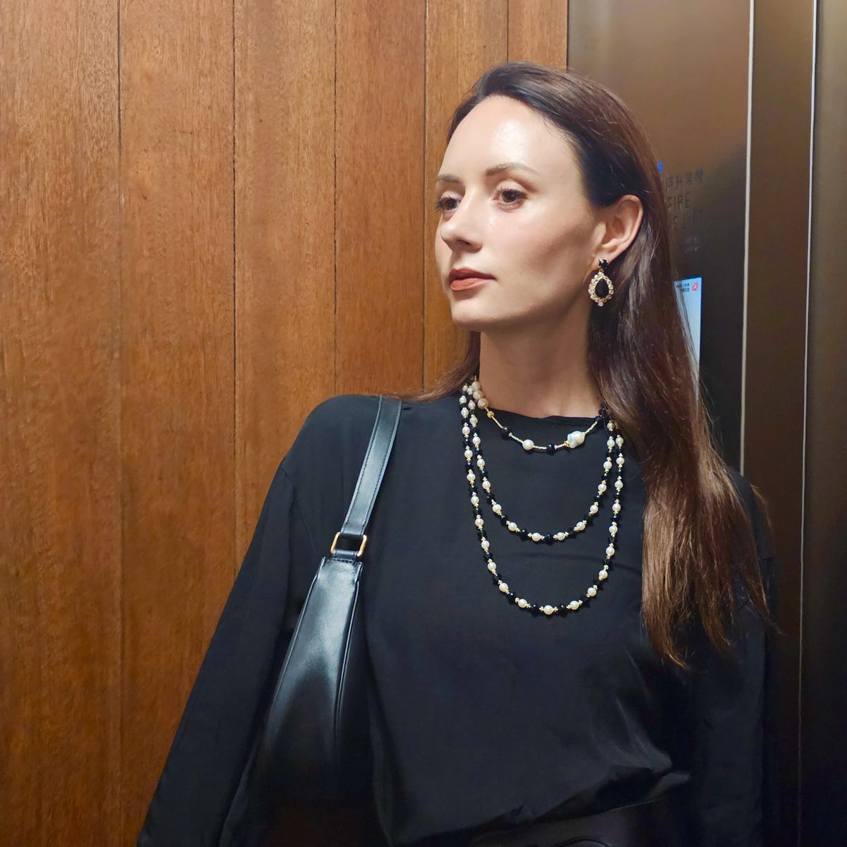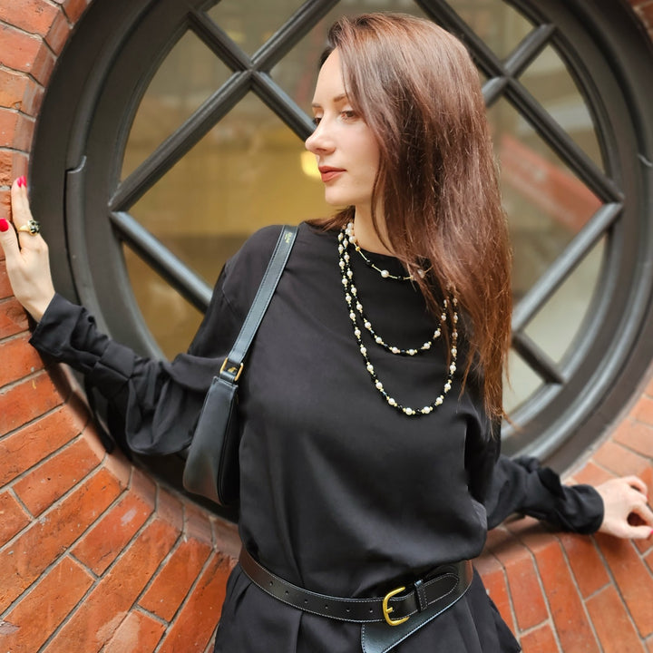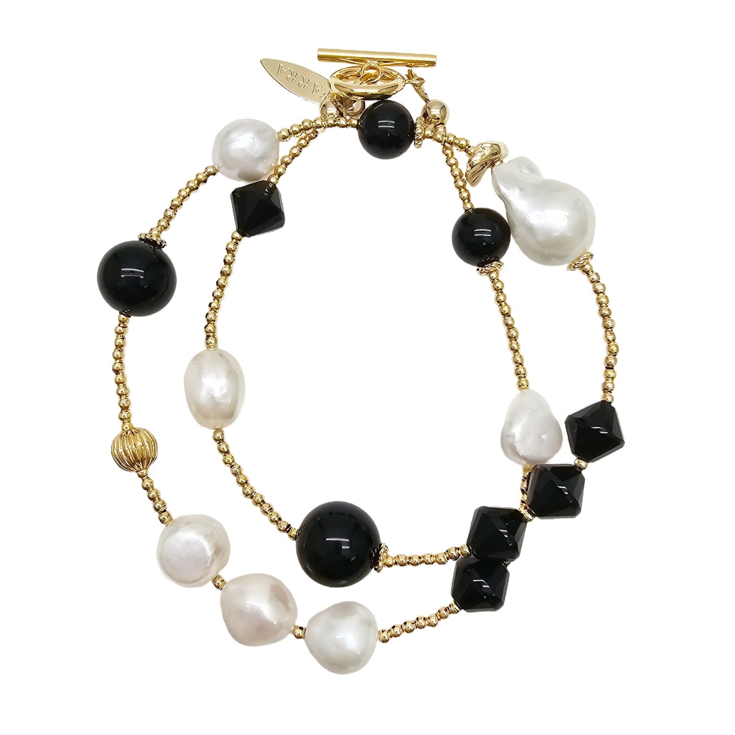 This double-layer bracelet/choker is made with natural black obsidian, freshwater pearls, and 14K gold-plated brass.
