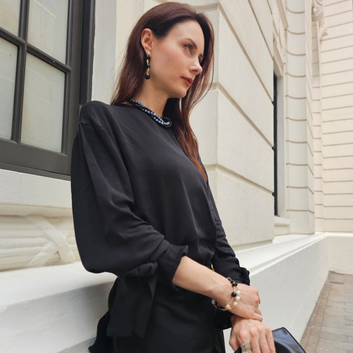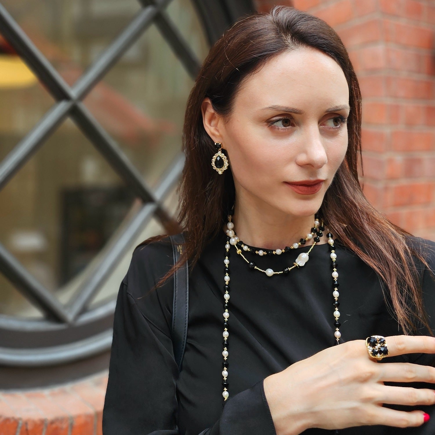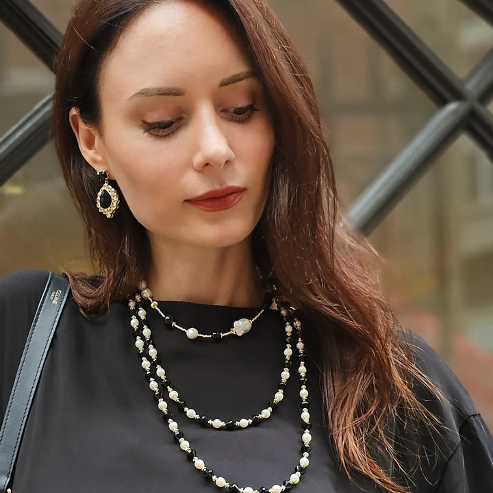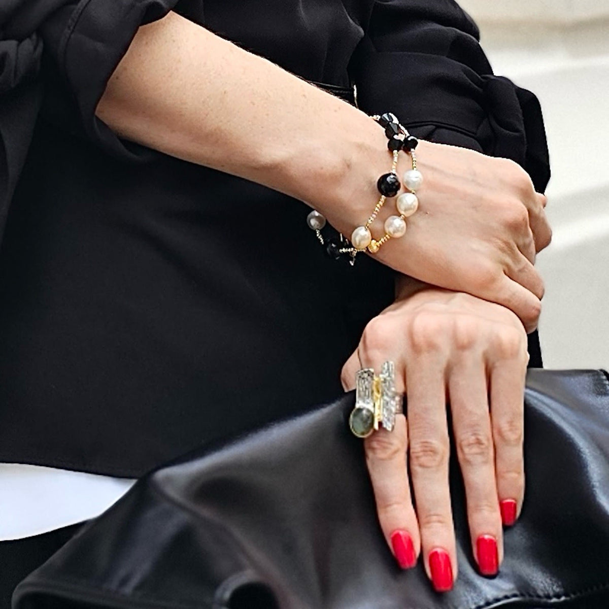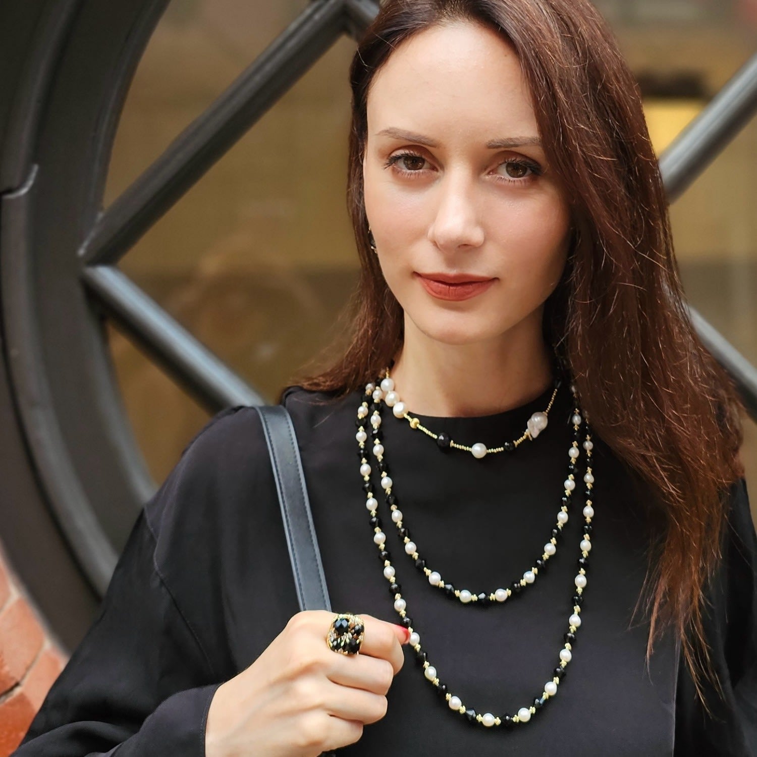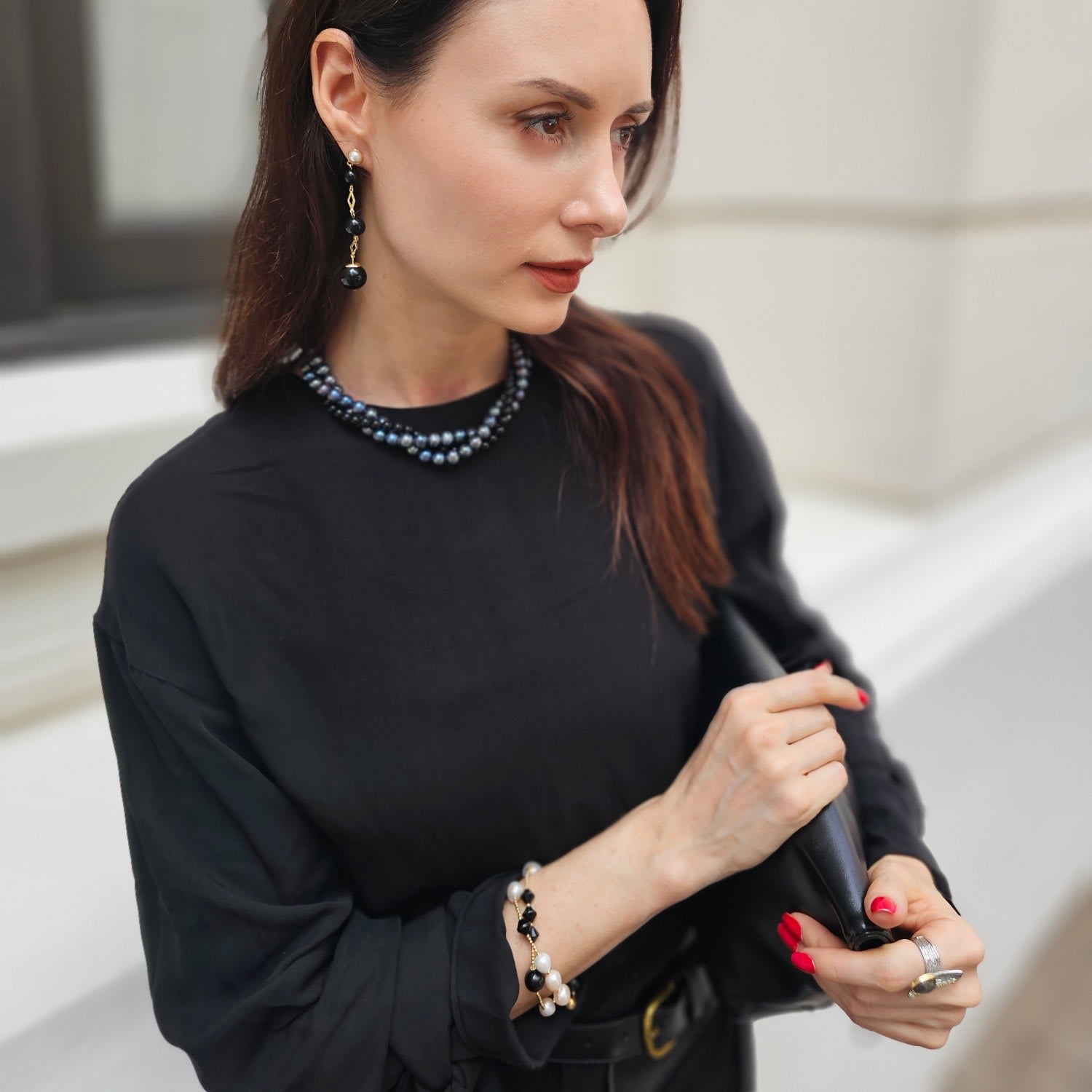 The Black Obsidian And White Pearls Double Layers Bracelet Or Choker by Farra is a versatile and meaningful accessory. It combines the protective energy of black obsidian with the elegance of baroque pearls. This double-layer piece can be worn as a bracelet or a choker, offering effortless style changes while enhancing your aura.