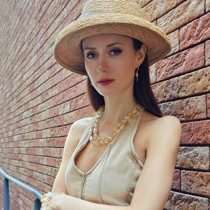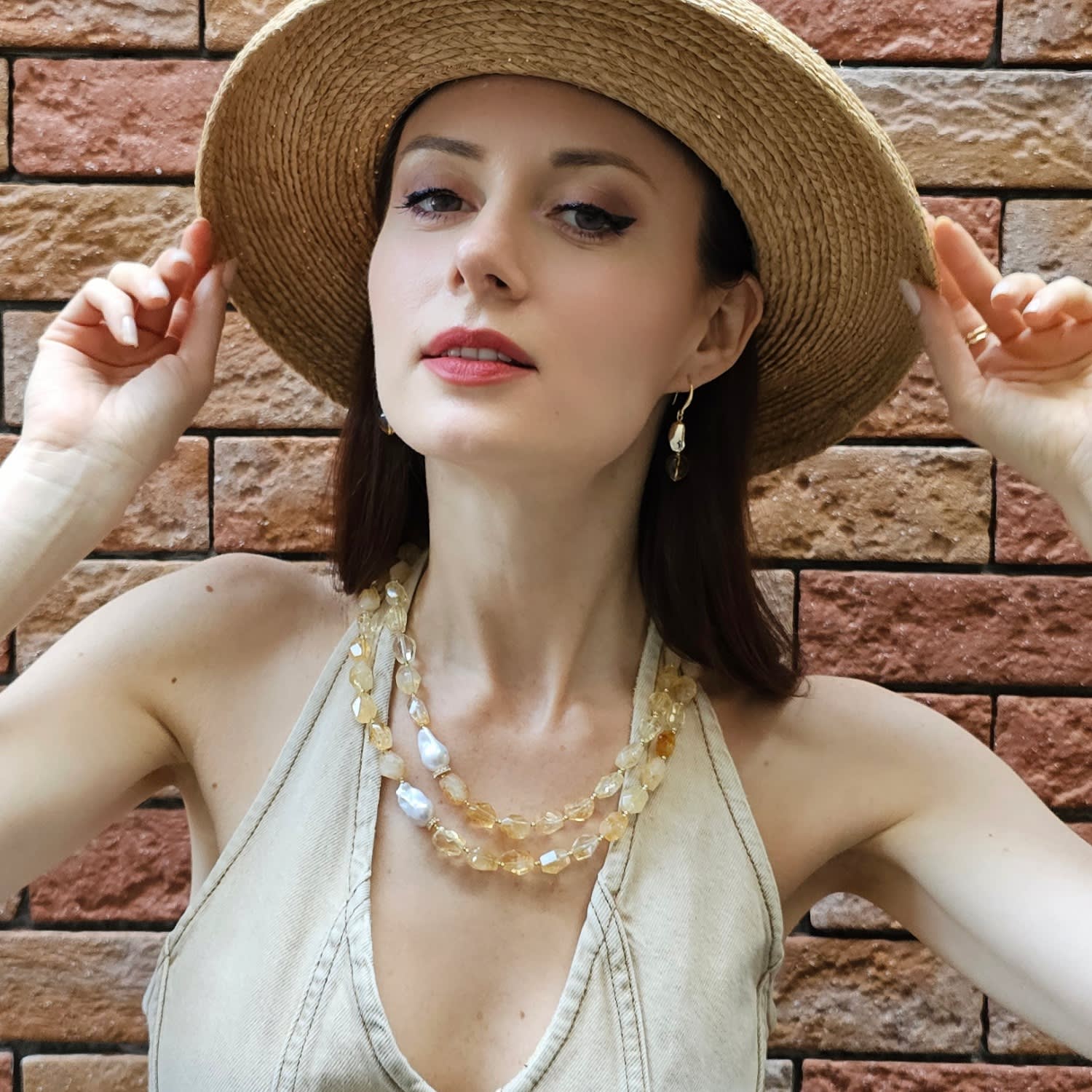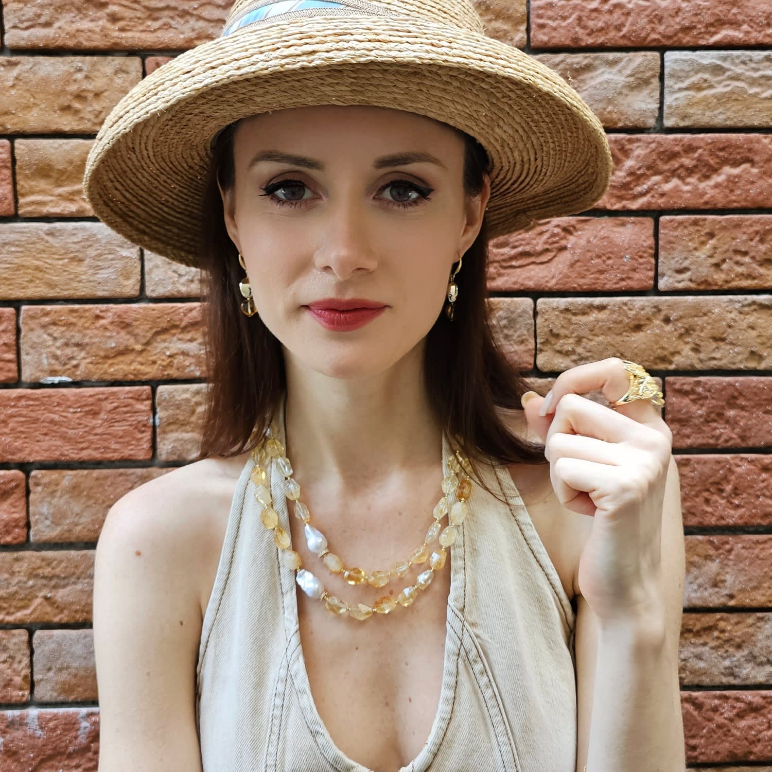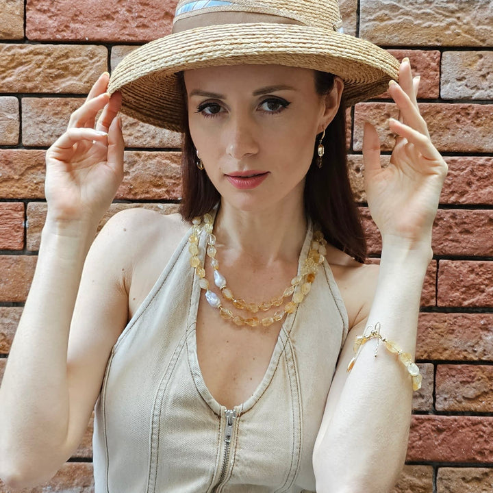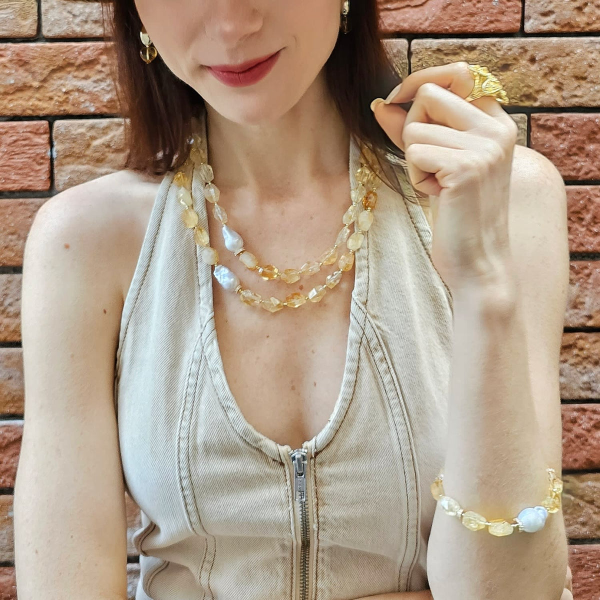 This layered necklace is made with faceted citrine stones and baroque pearls.