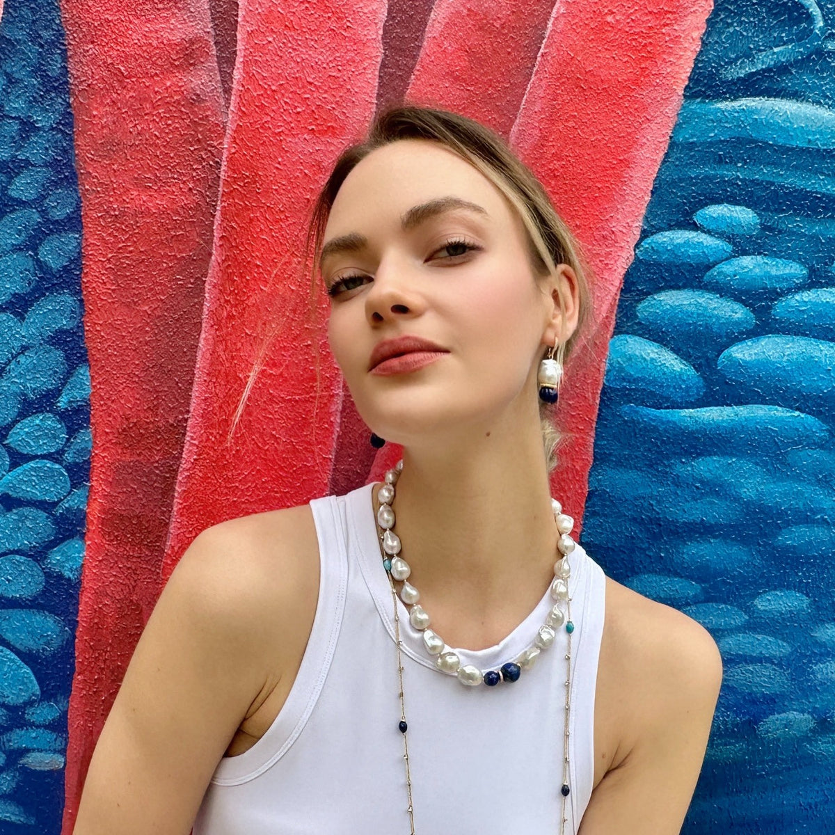 These pearl earrings are made with natural cultured freshwater pearls and natural lapis stones. The metal is 14K gold-plated brass.