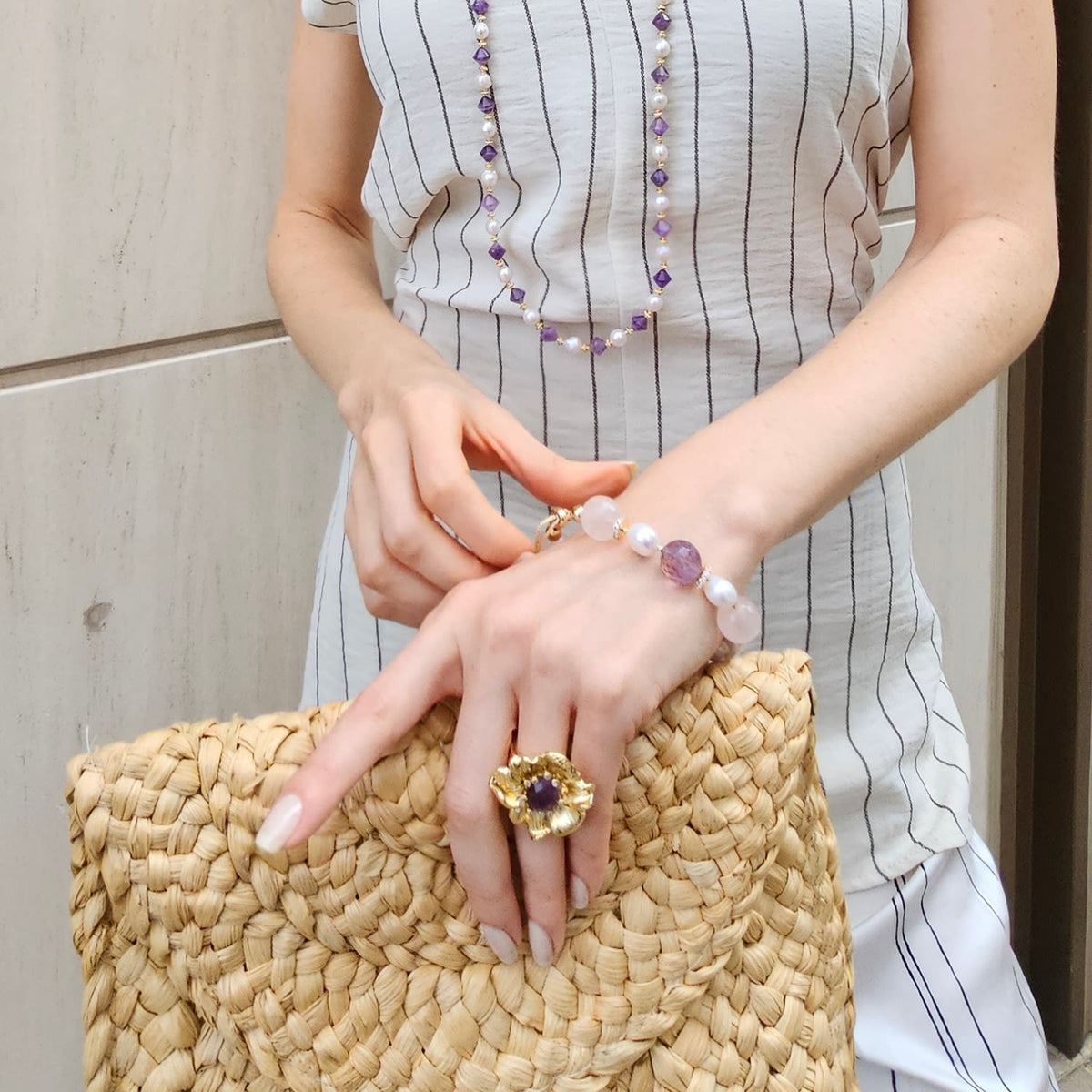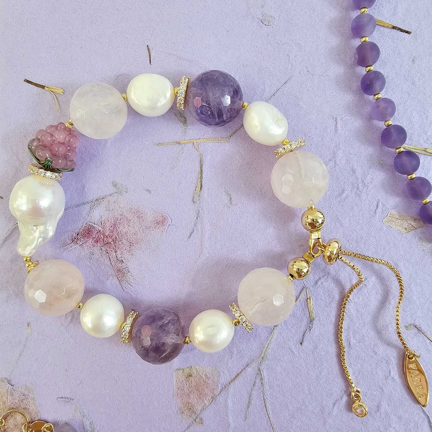 This beaded bracelet is made with baroque pearls, rose quartz, amethyst beads, and glass raspberry beads.