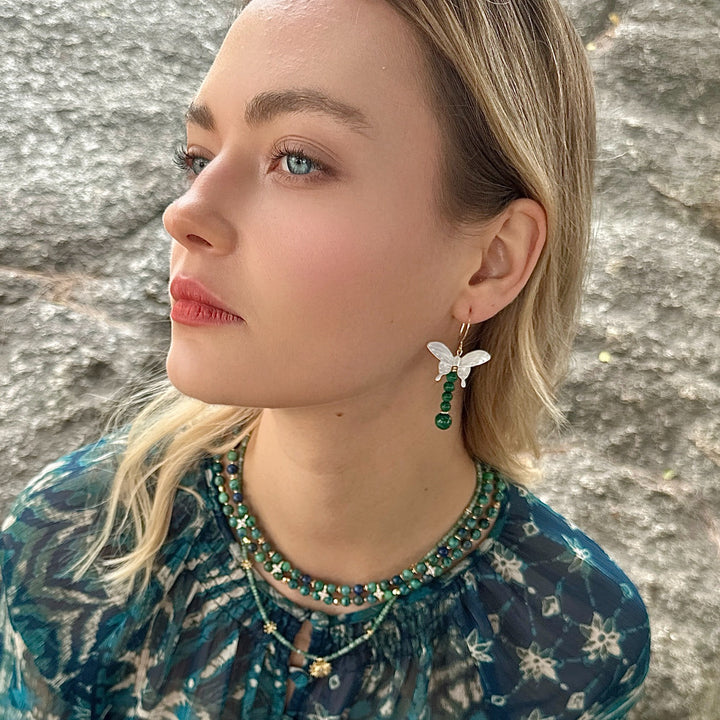 This pendant necklace is made with natural emerald and 14K gold-plated brass.