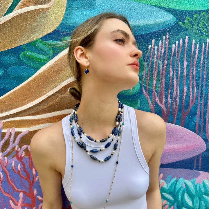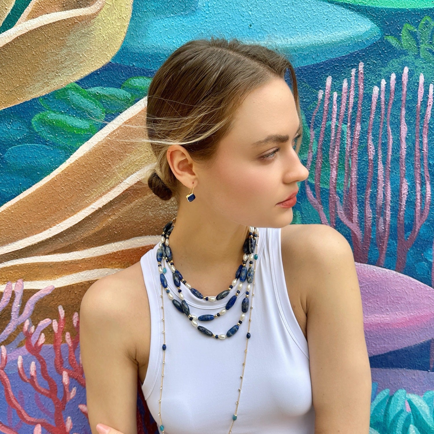 This layered necklace is made with natural lapis lazuli and freshwater pearls. The metal is 14K gold-plated brass.