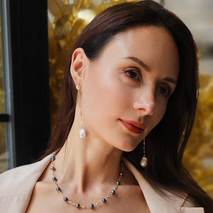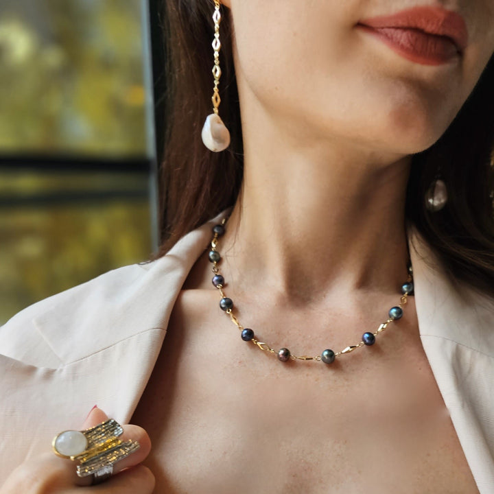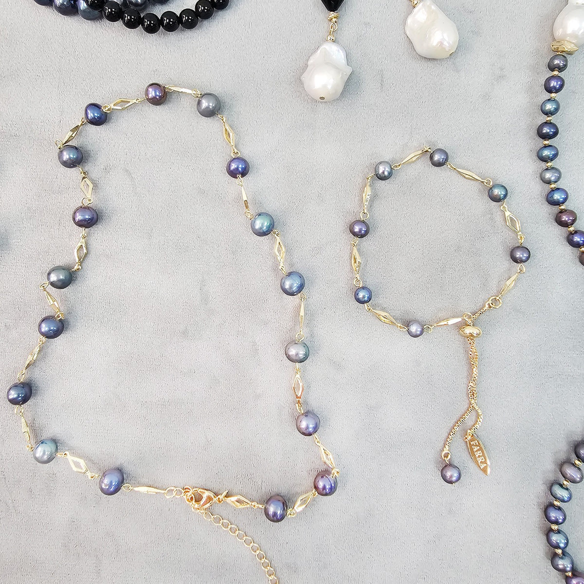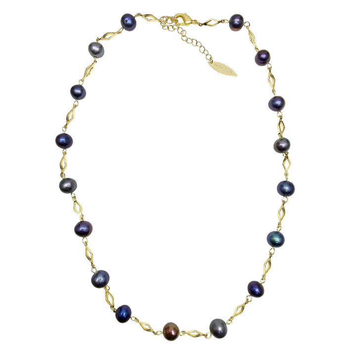 This pearl necklace is made of 14K gold-plated brass and is set with purple freshwater pearls.