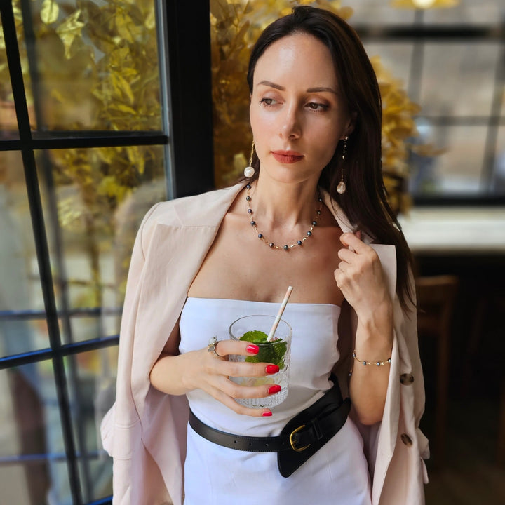 The Purple Natural Pearls Minimalist Necklace by Farra is a modern take on classic elegance. This pearl necklace features lustrous purple freshwater pearls in a minimalist style, highlighting their natural beauty. It can be worn alone or layered and is made with 14K gold-plated brass.