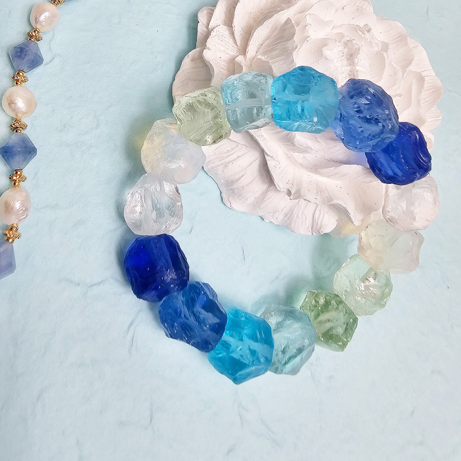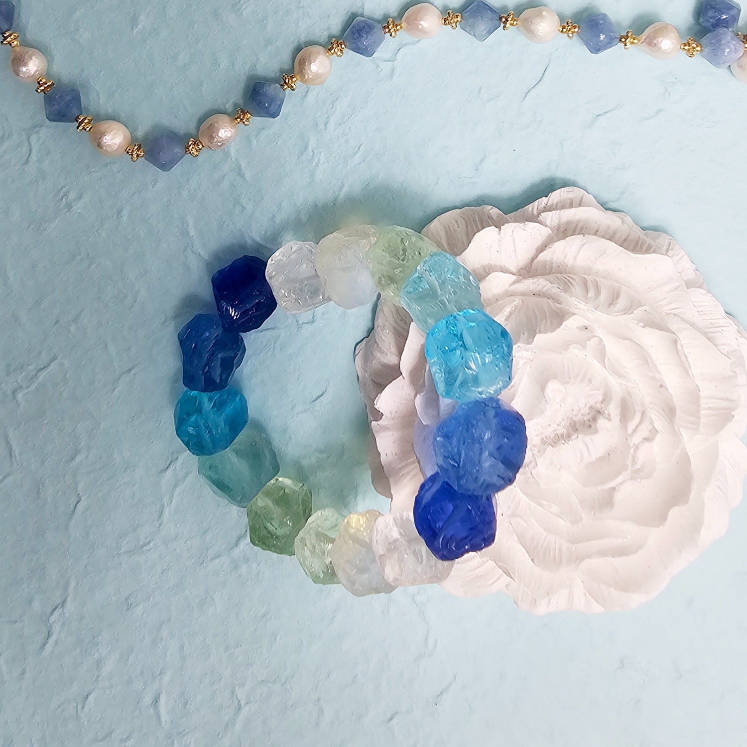 This bracelet is made with matte aquamarine, kyanite, green fluorite, and citrine. The clasp and other metal components are not specified.