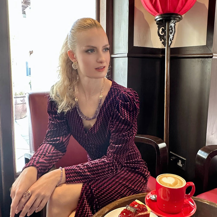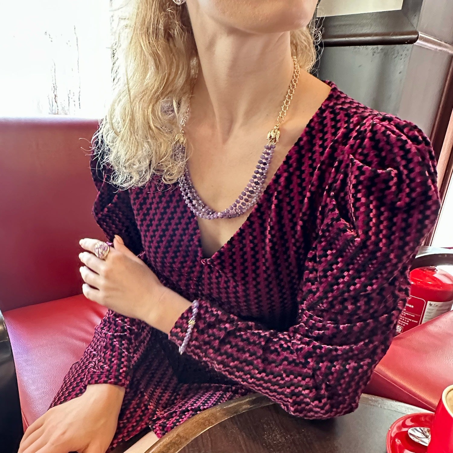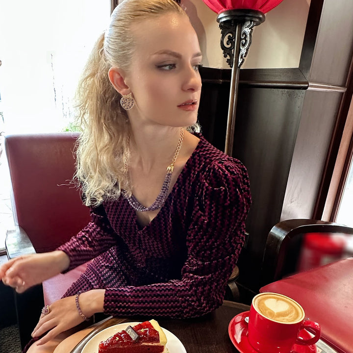 This Multi-Layers Amethyst Necklace by Farra is an exquisite accessory that adds a touch of sophistication to any ensemble. With its captivating flower charm and versatile design, it's perfect for pairing with printed dresses or cozy knitwear. Amethyst, the February birthstone, is believed to have calming properties, making this elegant piece not only a beautiful style enhancer but also a source of peace and clarity.