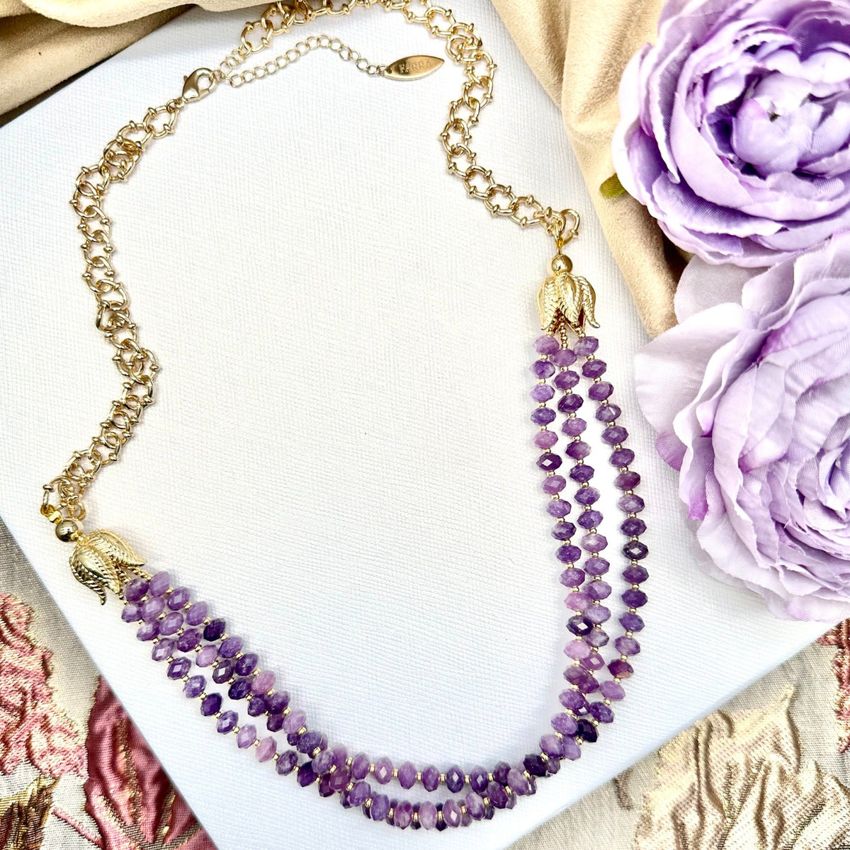 This necklace is made with natural amethyst, a flower charm, and an adjustable 14K gold-plated brass chain. It is a multi-layered necklace.