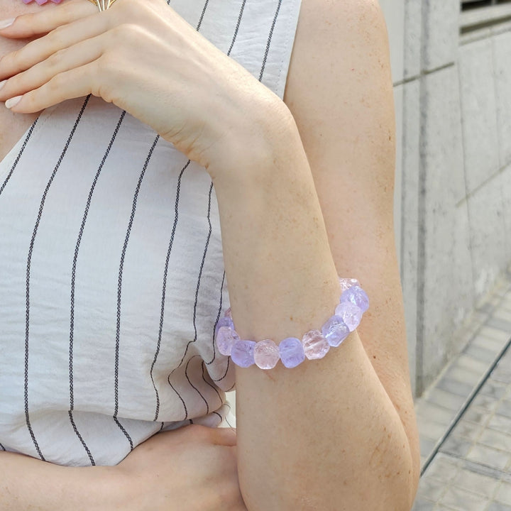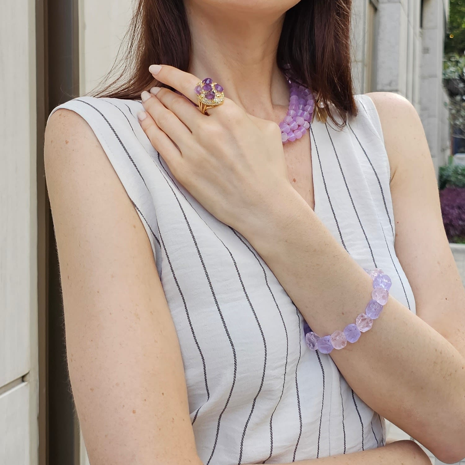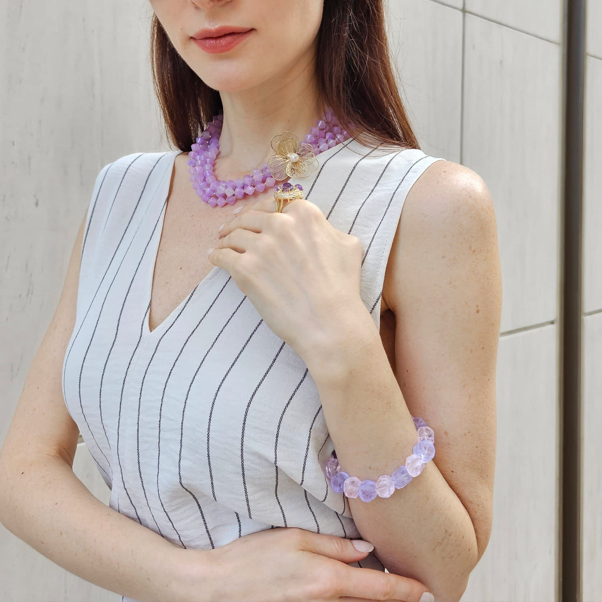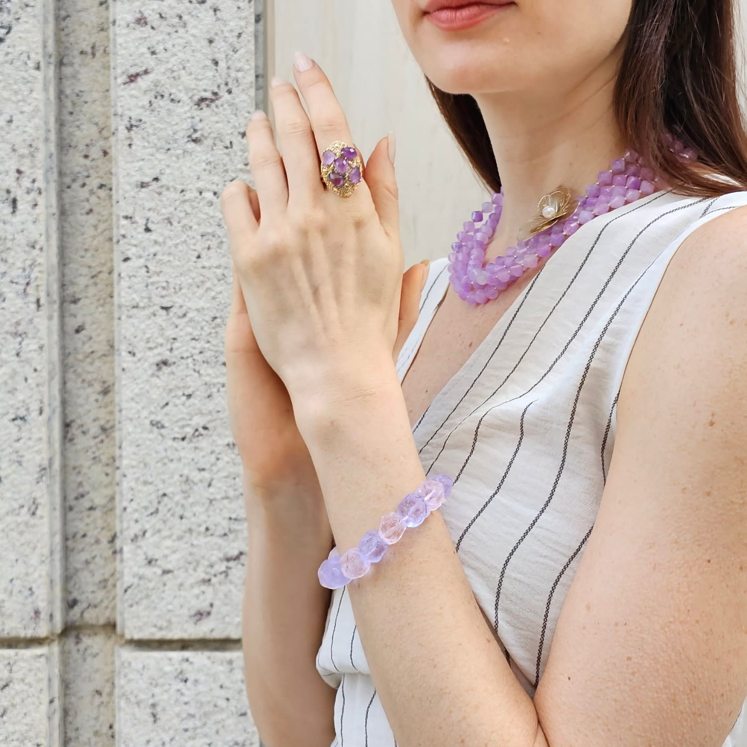 This Nugget Amethyst And Rose Quartz Stretchy Bracelet by Farra is a beautiful celebration of natural beauty and positive energy. The unpolished amethyst nuggets and delicate rose quartz beads create a soft, loving aesthetic. This versatile bracelet, perfect for layering, symbolizes calmness, clarity, and unconditional love, making it a heartfelt and meaningful gift.