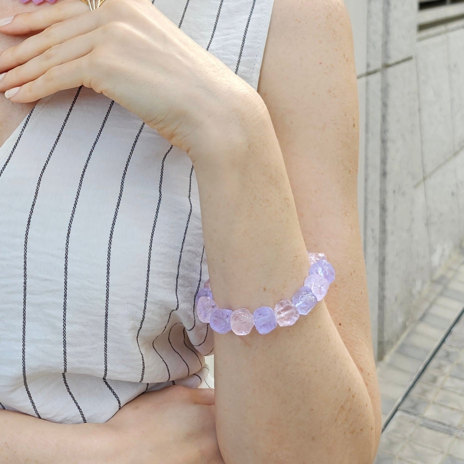This bracelet is made with unpolished amethyst nuggets and rose quartz beads on a stretchy band.