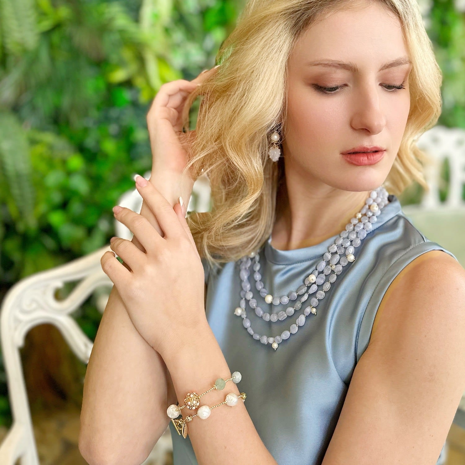 This double-layered bracelet is made with natural baroque pearls and aquamarine gemstones. The material is not specified, but it can be worn as a choker.