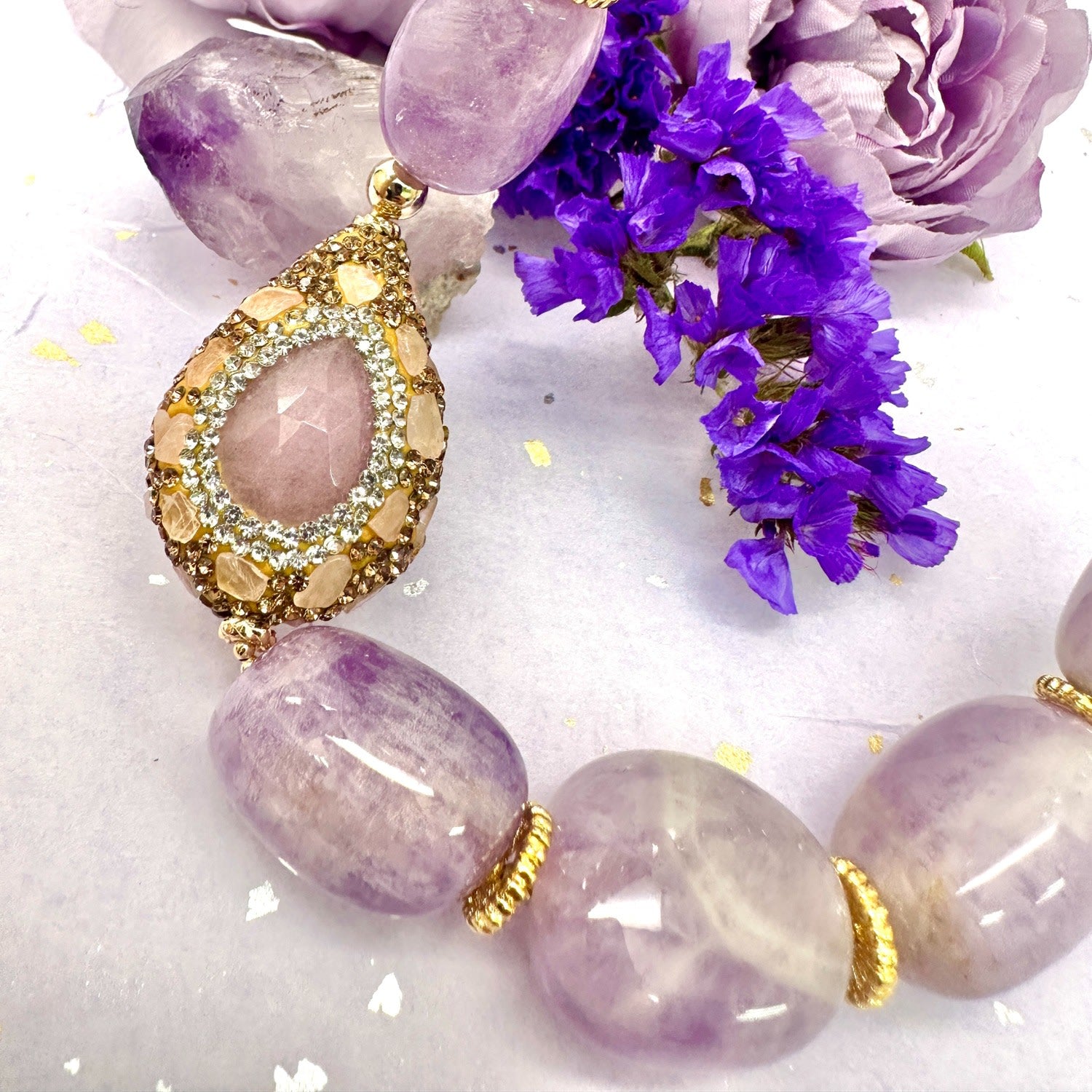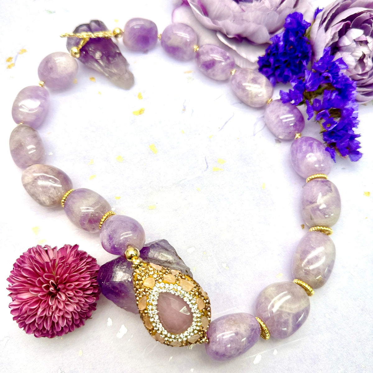 This necklace is meticulously handcrafted from nugget amethyst gemstones and handmade purple opal rhinestones.