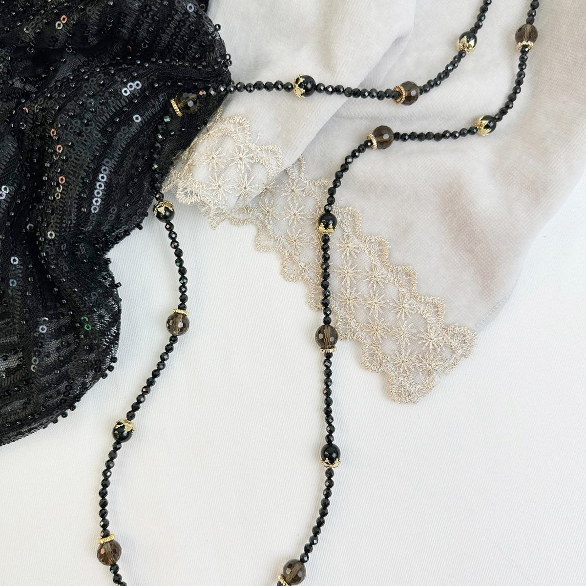 This necklace is crafted with natural black obsidian and smoky quartz. It is a long single chain that can be worn in multiple ways.
