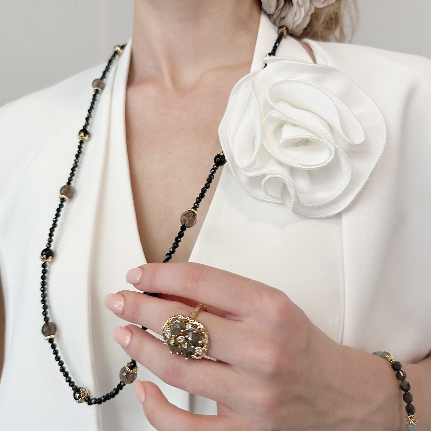 This Timeless Black Obsidian And Smoky Multi-Way Necklace by Farra is an elegant and versatile accessory. Skillfully crafted with black obsidian and smoky quartz, this long single chain can be wrapped to create a stylish double necklace, offering different wearing options. The combination of these two stones, which exude an air of confidence and allure, makes this necklace a timeless and thoughtful gift.