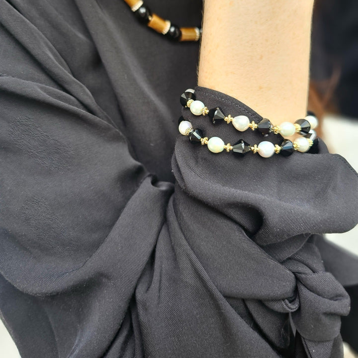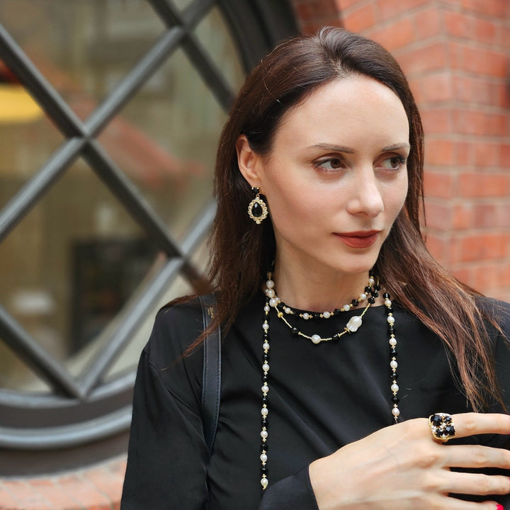 This Black Obsidian And White Pearls Short Necklace by Farra is a timeless and symbolic piece. The black obsidian is known for its protective qualities, while the high-luster white freshwater pearls exude elegance. This versatile choker can be worn around the neck or wrapped around the wrist as a double-layered bracelet, making it a stylish and meaningful accessory.