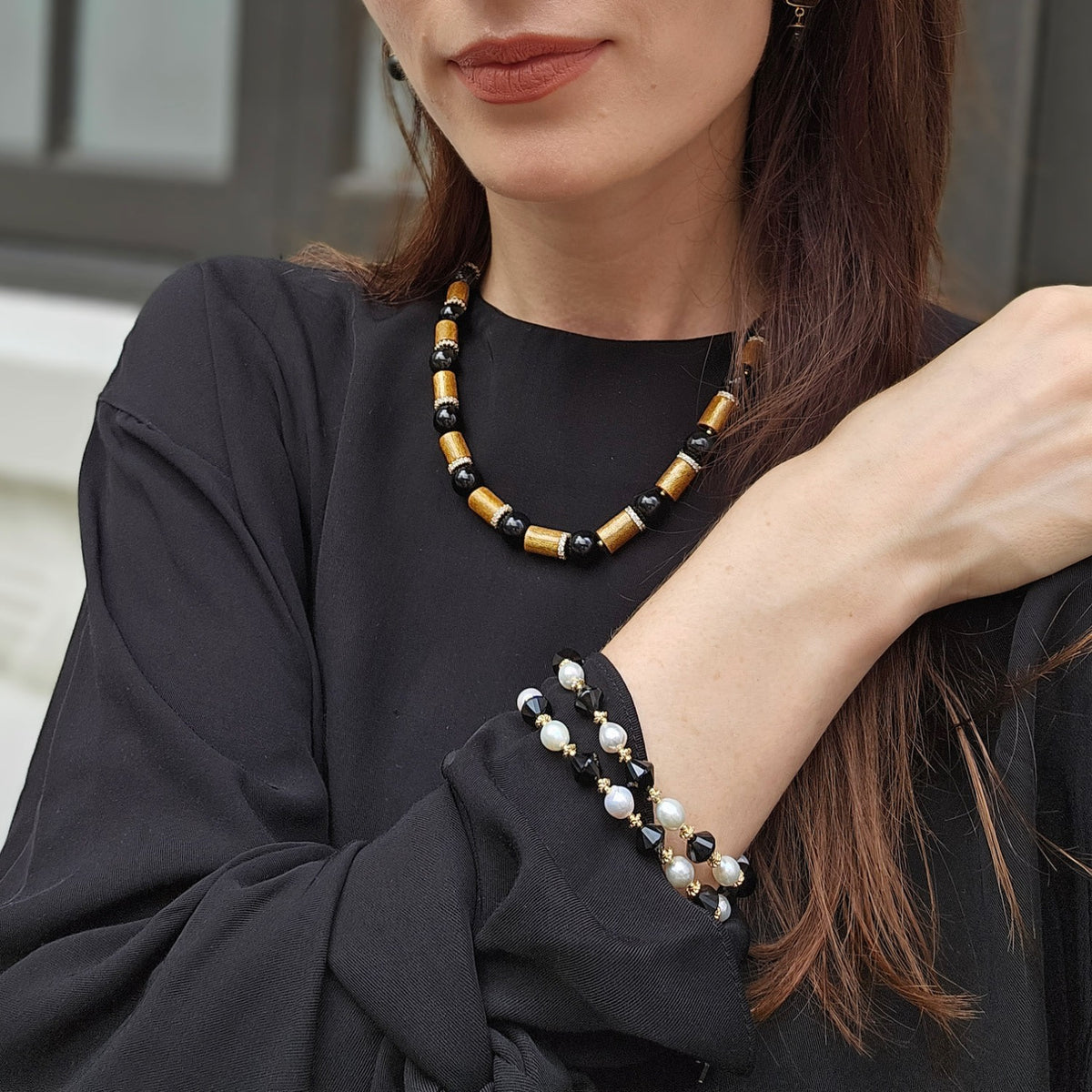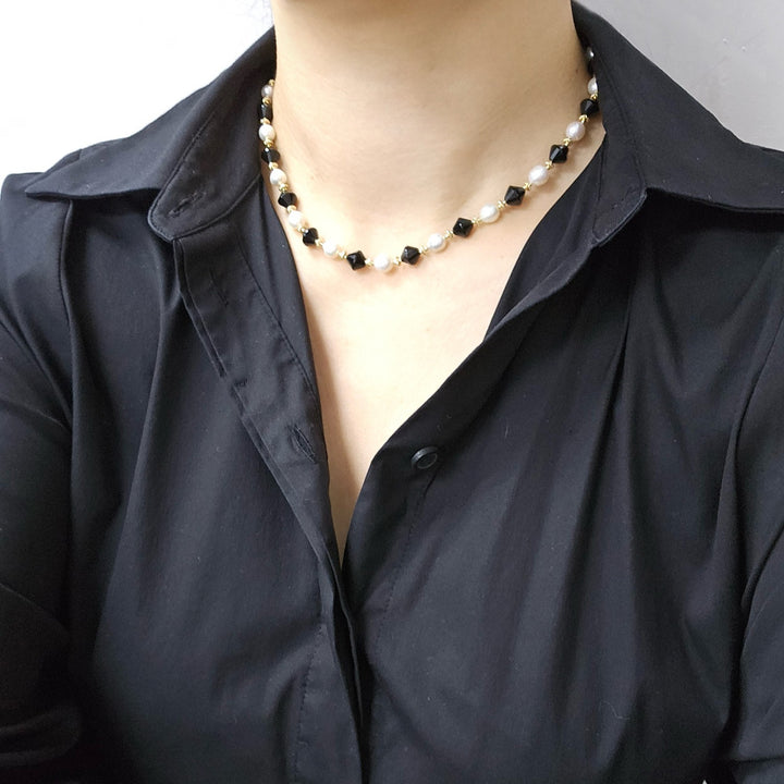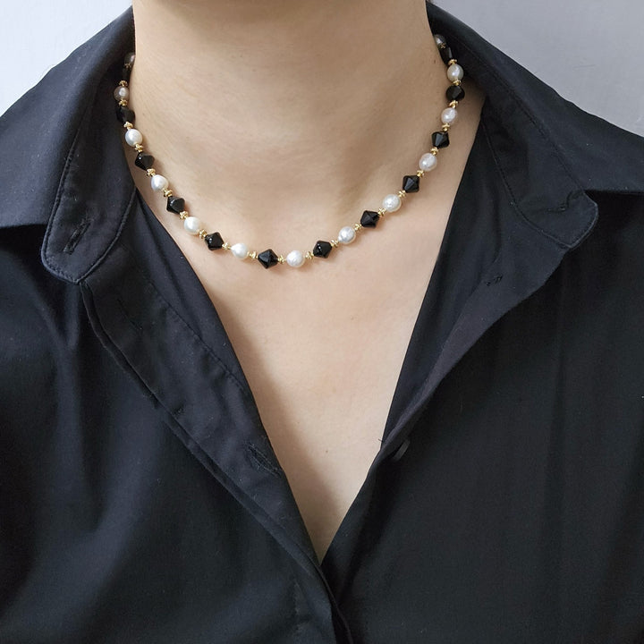 This choker is made with natural black obsidian, freshwater pearls, and 14K gold-plated brass jewelry findings.