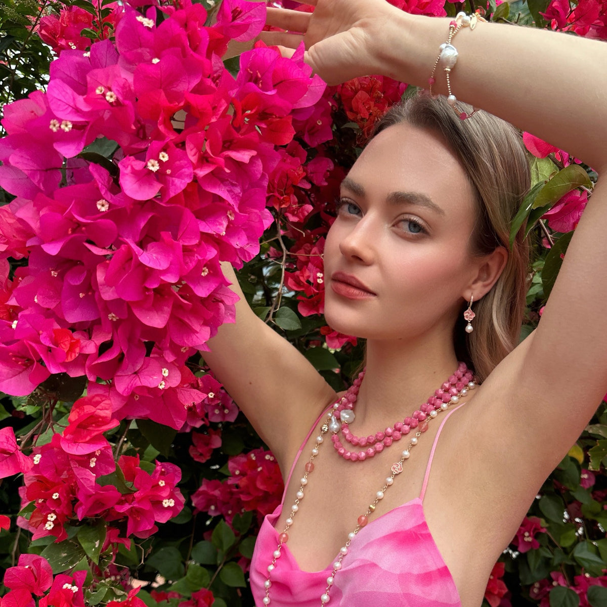 This piece features freshwater baroque pearls, pink rhodochrosite gemstones, and 14K gold plated brass.
