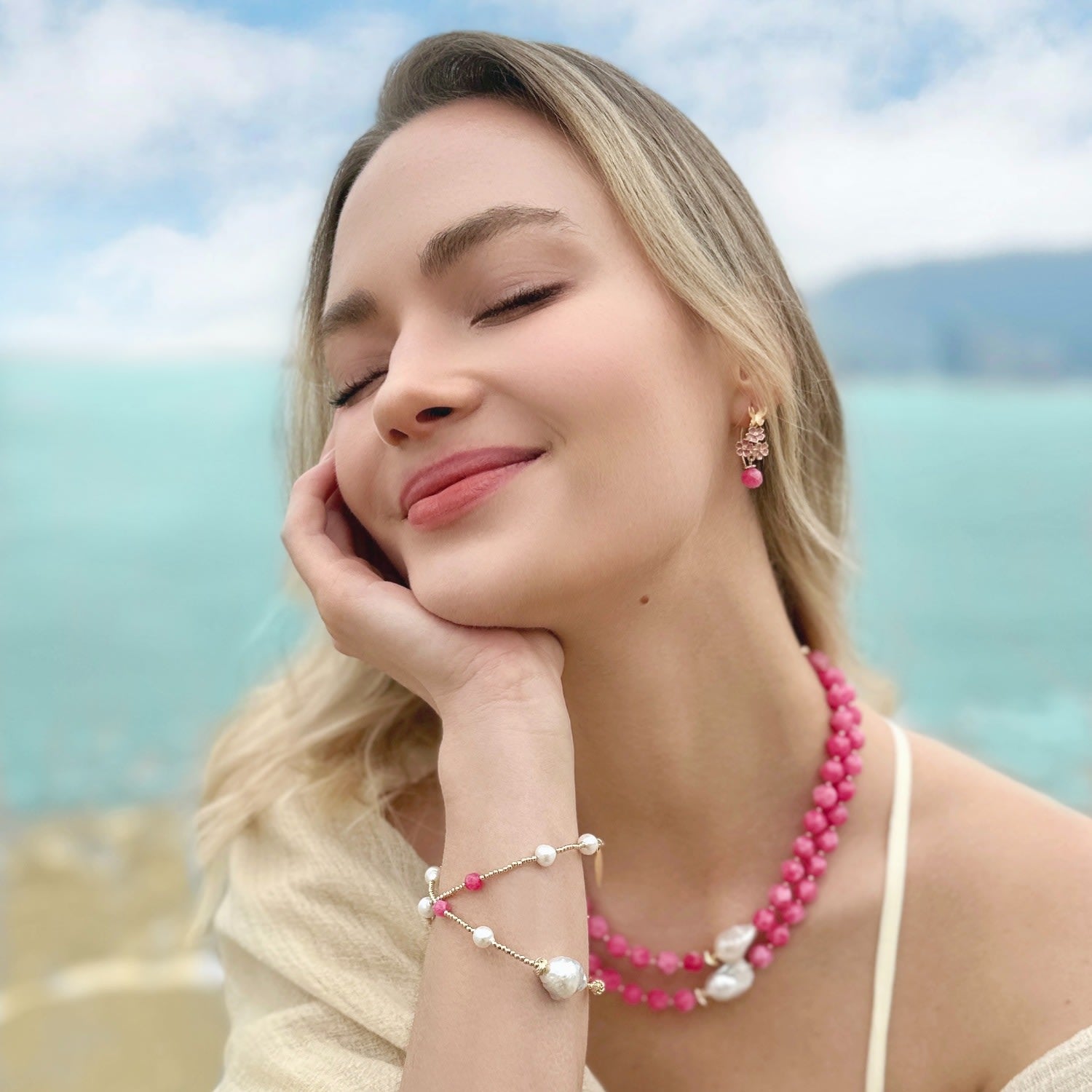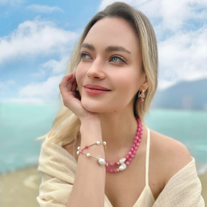 Baroque Pearls With Pink Gemstones Double Layers Bracelet / Choker
