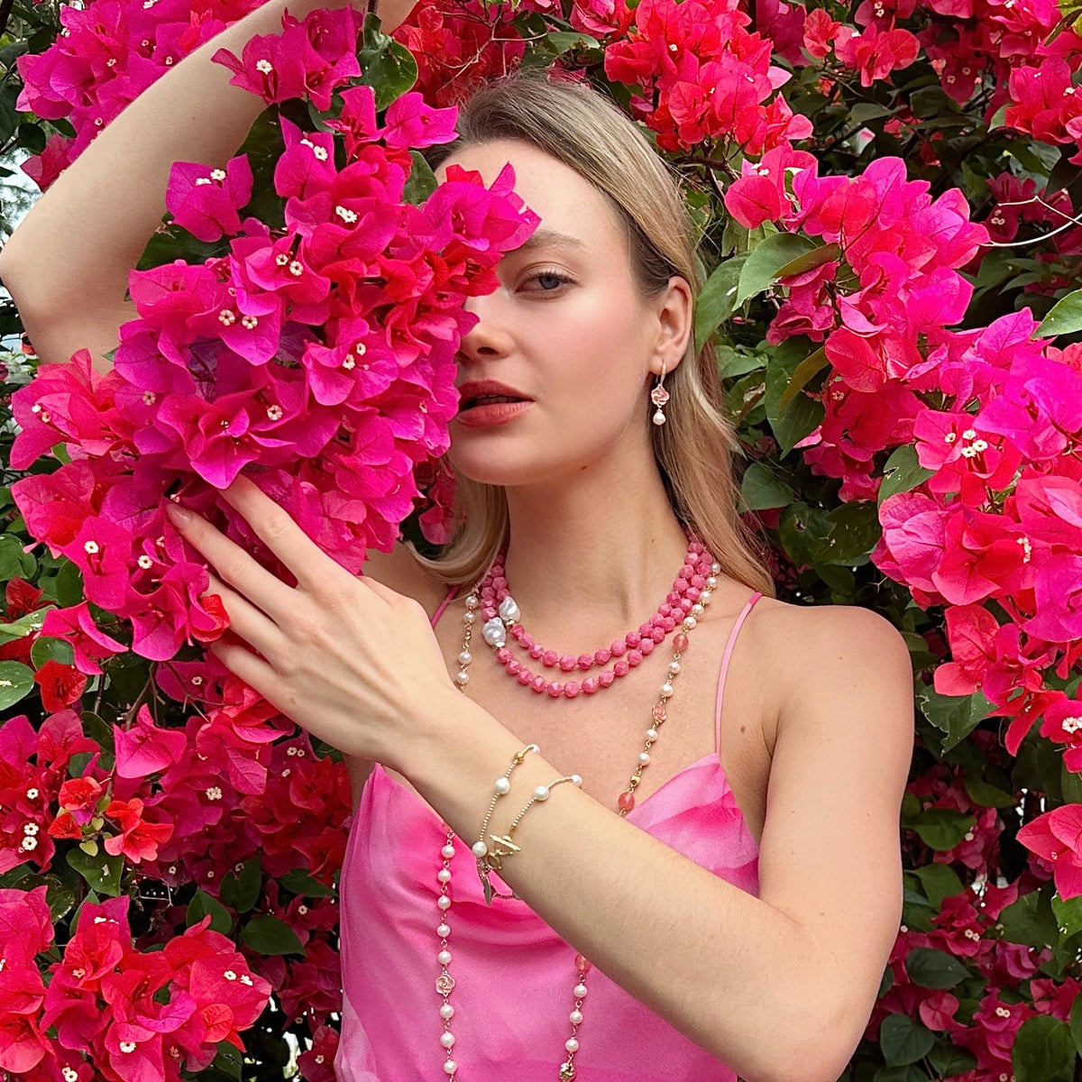 The Baroque Pearls With Pink Gemstones Double Layers Bracelet / Choker by Farra is a versatile piece that combines the organic charm of baroque pearls with the feminine touch of pink rhodochrosite gemstones. It can be worn as a double-layered bracelet or a stylish choker. The combination of unique, irregular pearls and captivating pink stones creates a harmonious and eye-catching accessory.