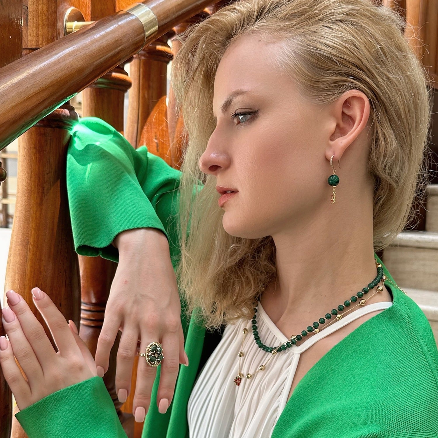 This Christmas Malachite With Chain Chain Double Layers Necklace by Farra is a beautiful and versatile accessory. Its double-layered design features a malachite gemstone pendant, known for its rich green color and protective properties, making it a meaningful choice for the Christmas season. This lightweight necklace is easy to transition from day to night and pairs perfectly with earrings for a festive look.