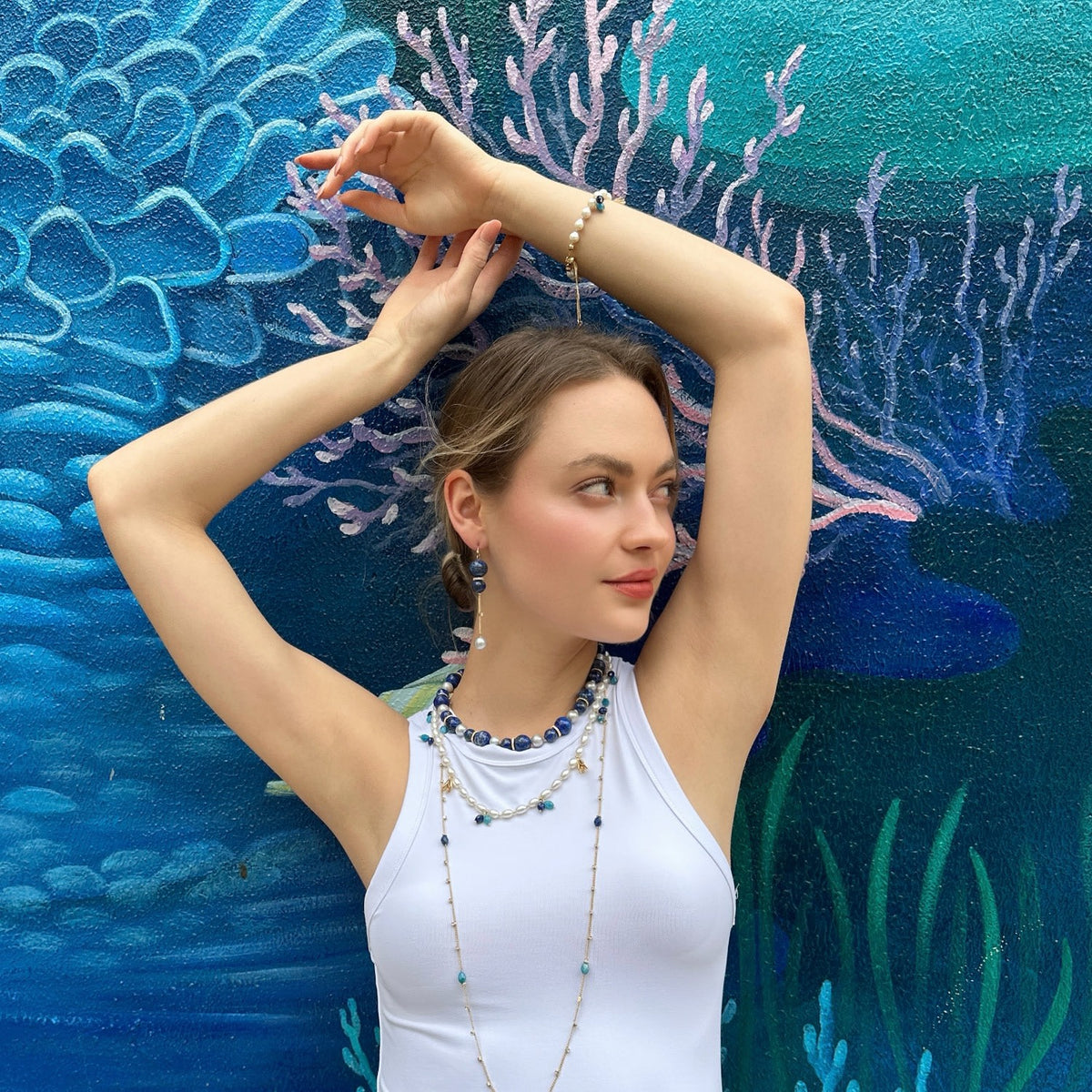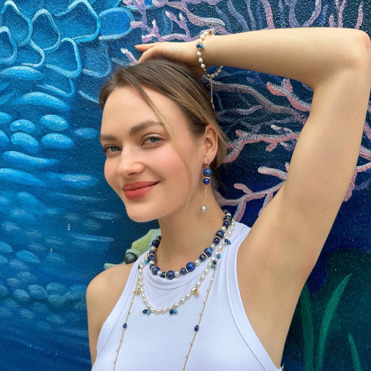 This chunky necklace features natural lapis lazuli gemstones, gray freshwater pearls, and 14K gold-plated brass findings.