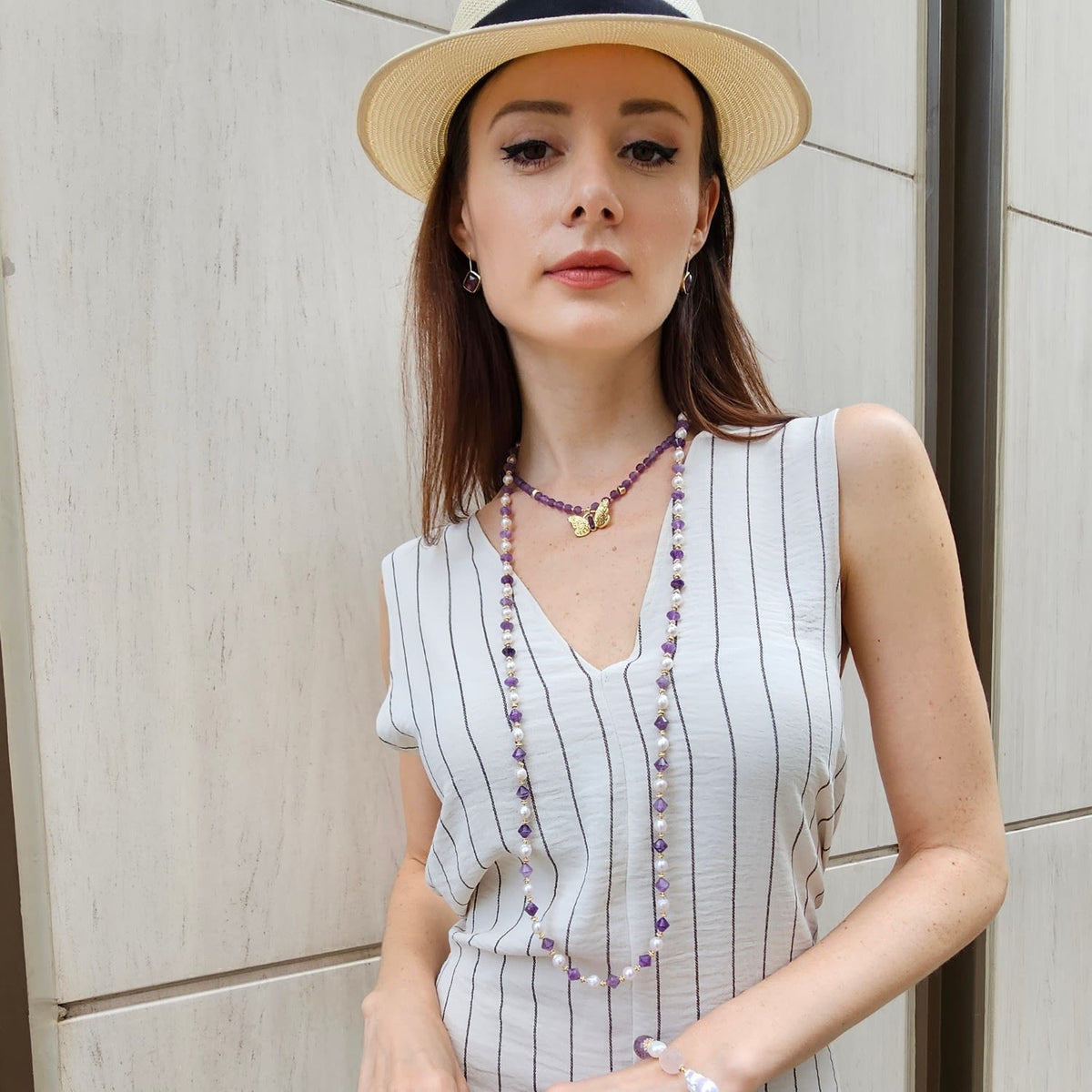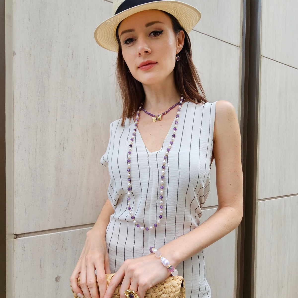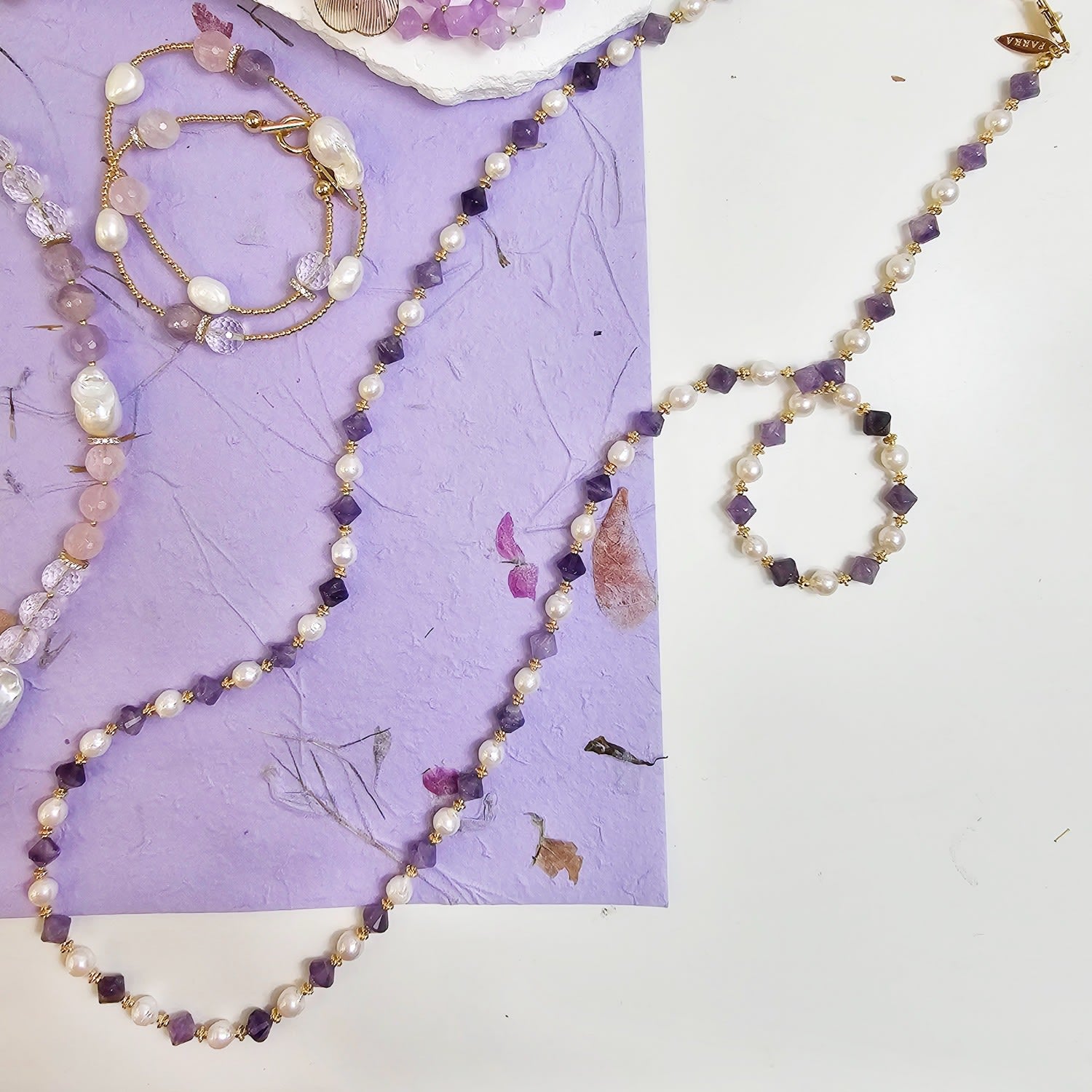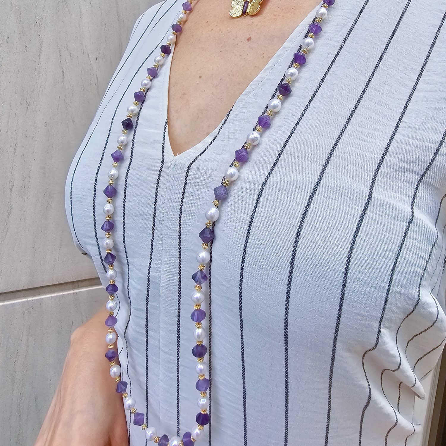 The Freshwater Pearls With Amethyst Long Versatile Necklace by Farra is a stunning and versatile piece. It features freshwater pearls interspersed with vibrant amethyst stones. The long design allows for multiple styling options, while the amethyst adds a calming energy and is associated with abundance.